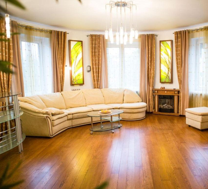 Просторная светлая гостиная с домашним кинотеатром и электрокамином.