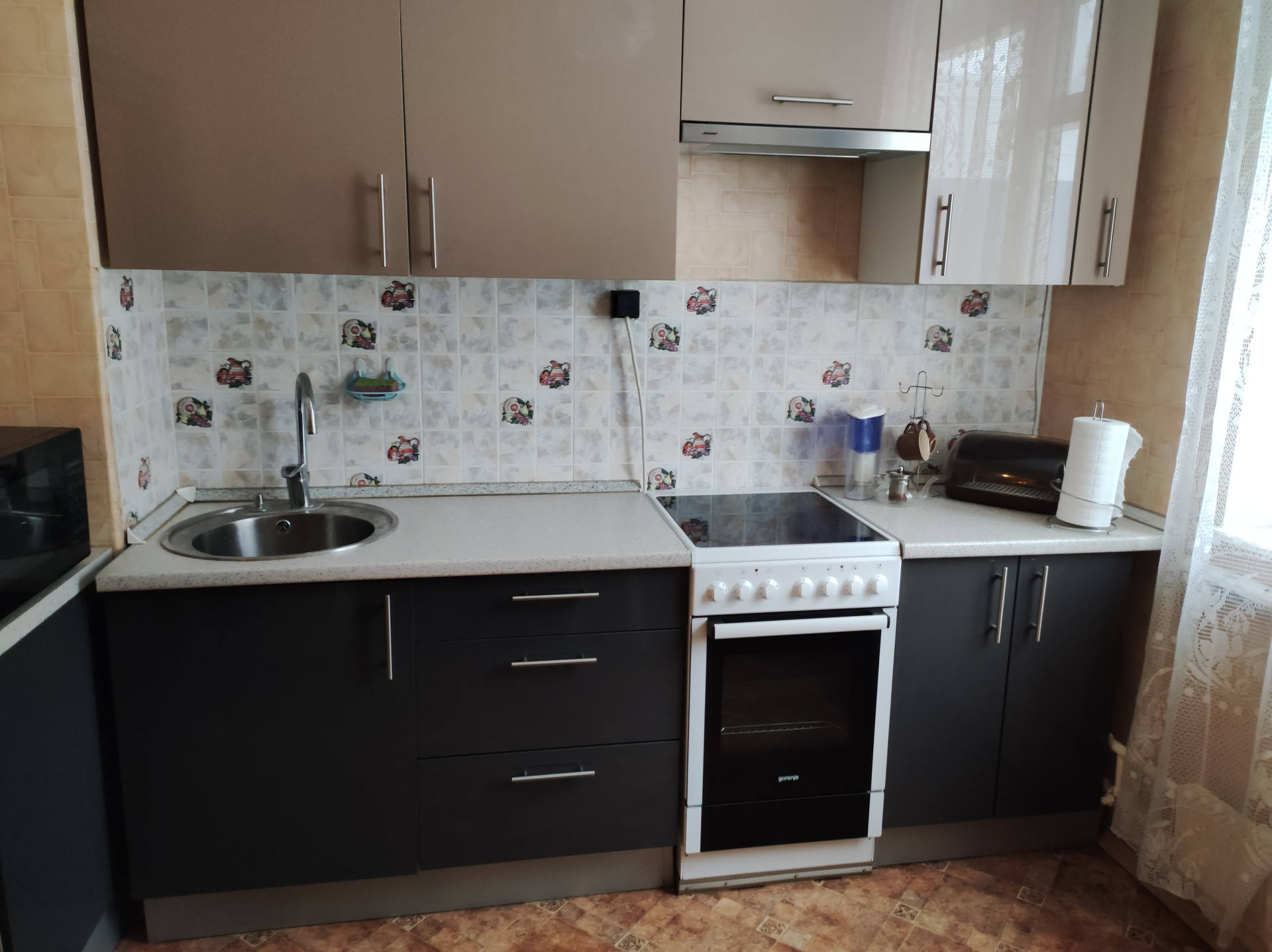 На кухне так же вся бытовая техника - плита gorenje, вытяжка, микроволновка, холодильник.