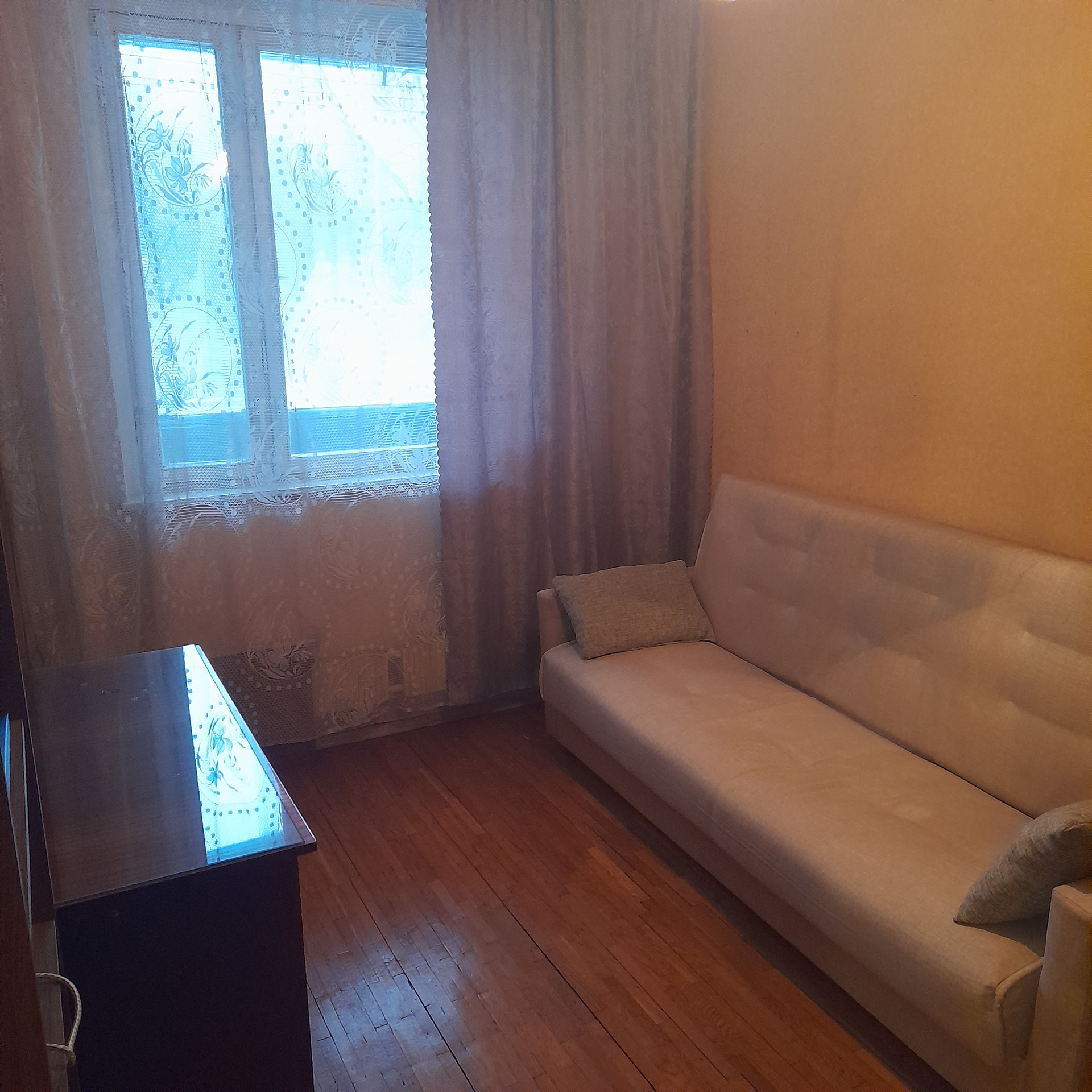 Сдам двухкомнатную квартиру (в трехкомнатной, одна комната закрыта). Комнаты изолированные, кухня отдельно, длинный коридор, санузел раздельно, имеется стиральная машина. В квартире есть все необходимое для проживания. В комнатах спальные места, шкафы, стол, телевизор. На полу паркет.
