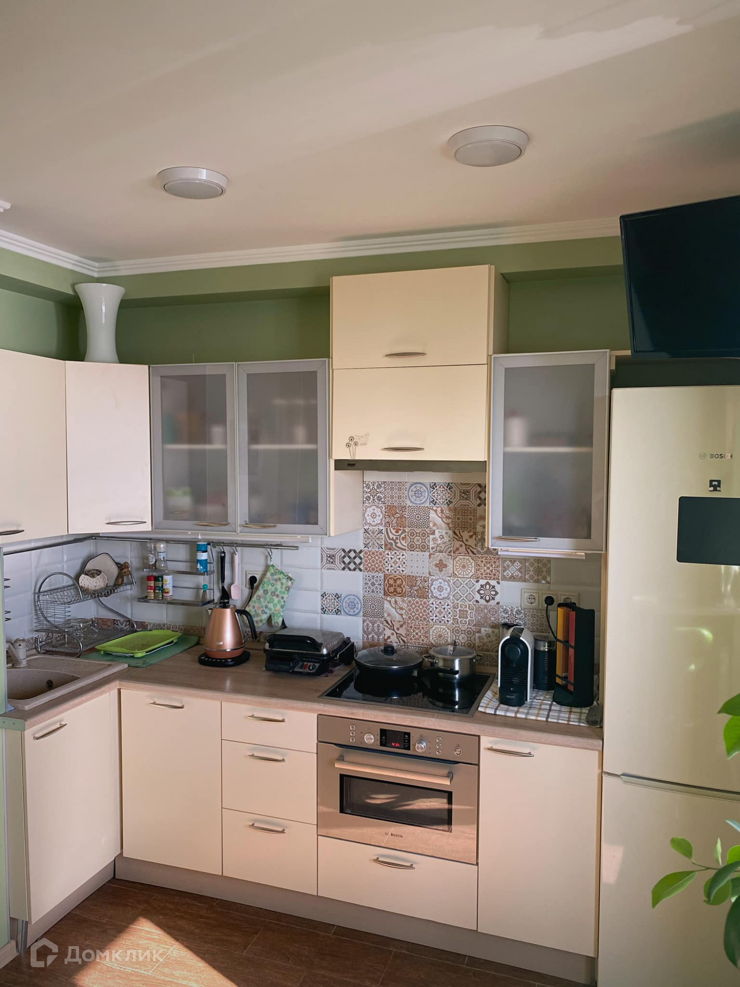 духовка+СВЧ, варочная панель, холодильник, посудомоечная машина, чайник, гриль, кофемашина Nespresso, телевизор