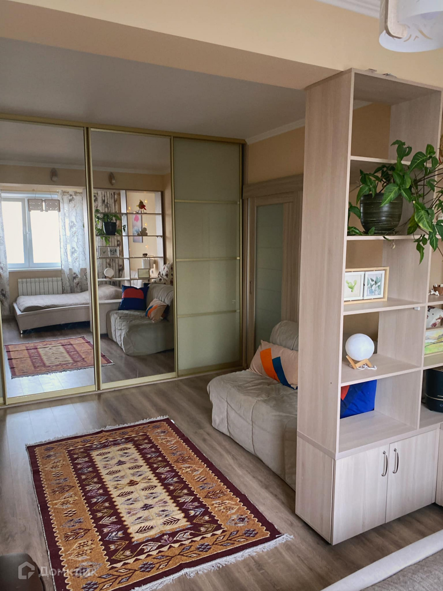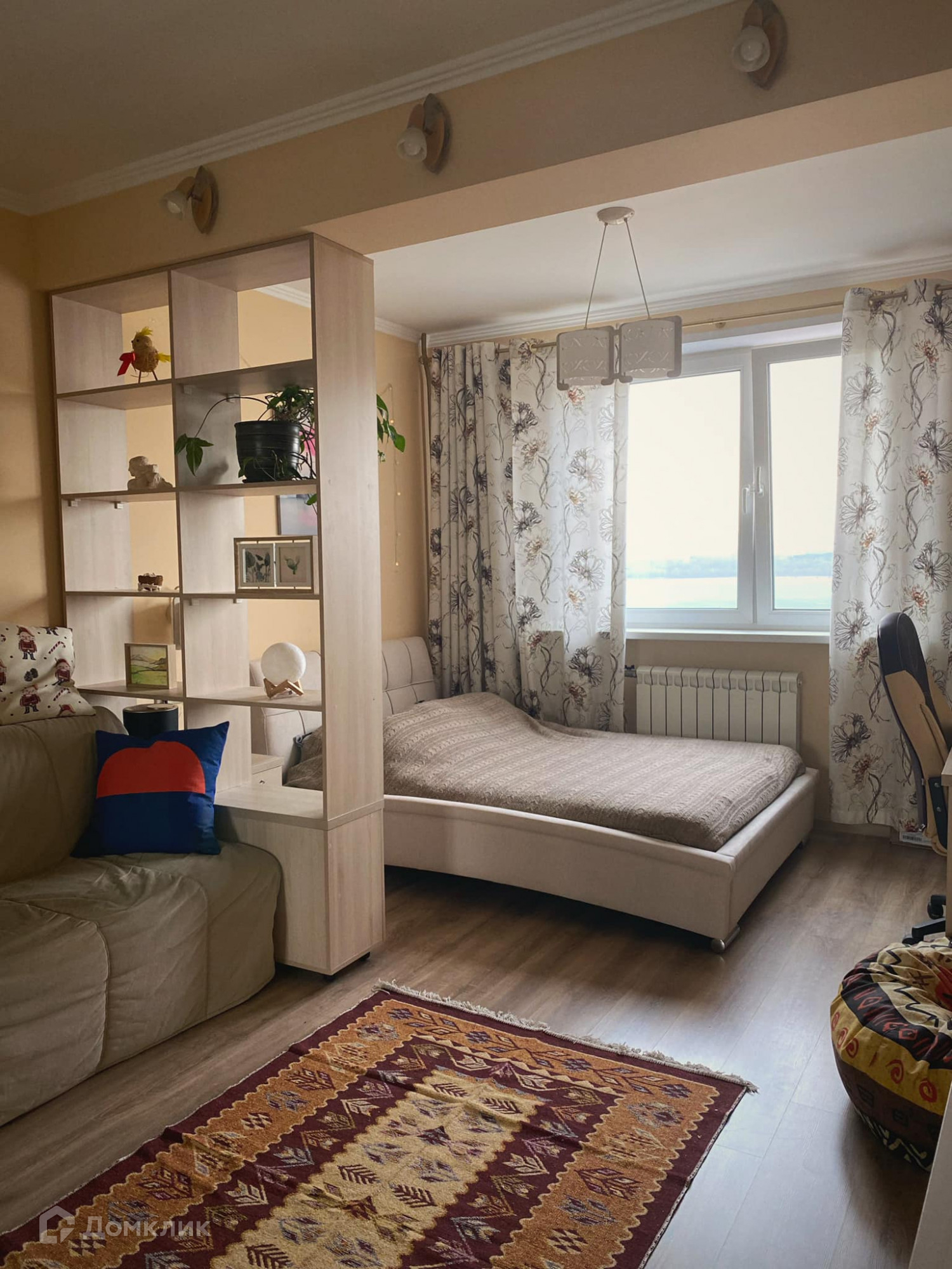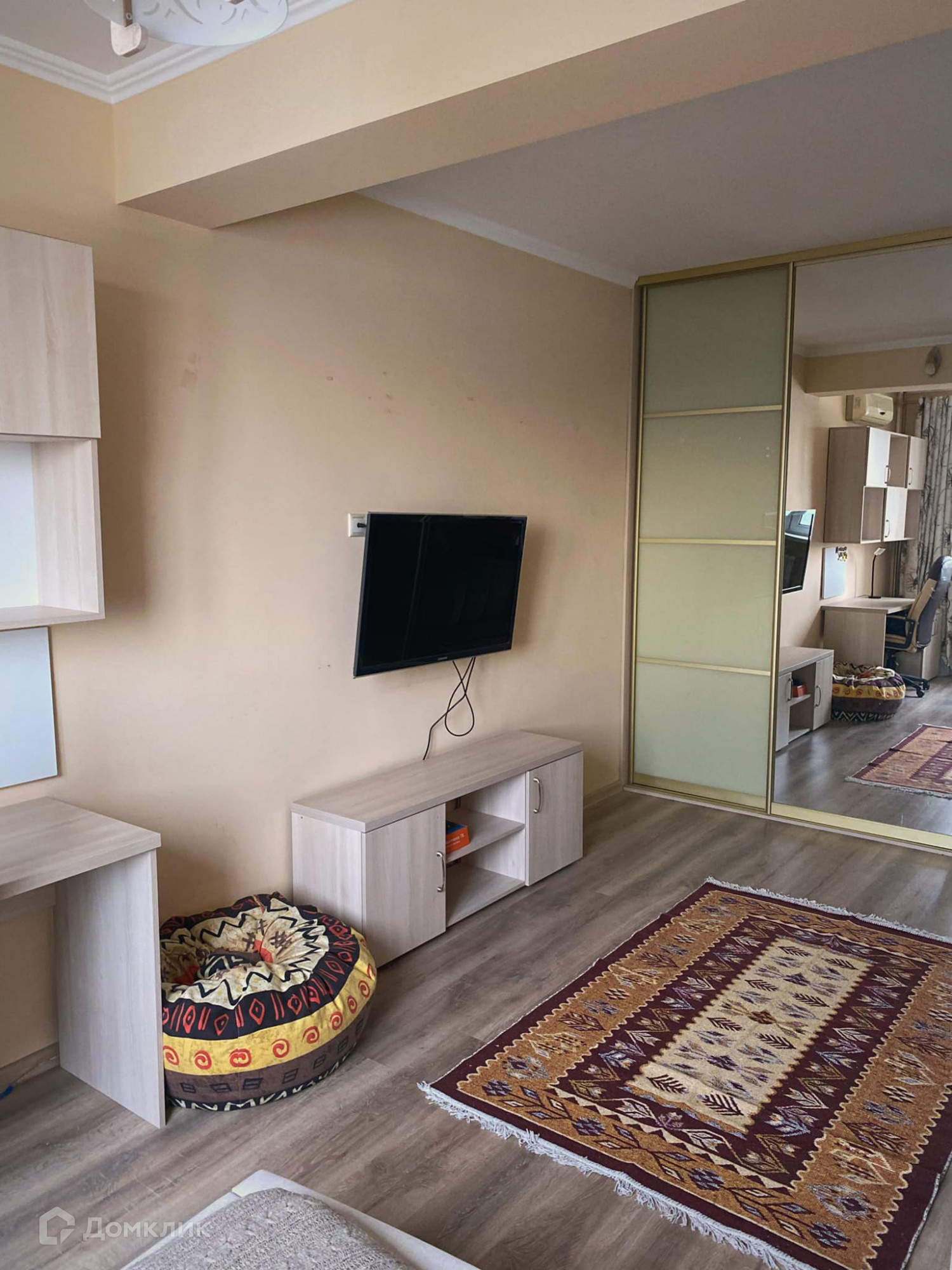 - двуспальная кровать, компактный раскладной диван, большой вместительный шкаф-купе, рабочий стол с креслом, телевизор