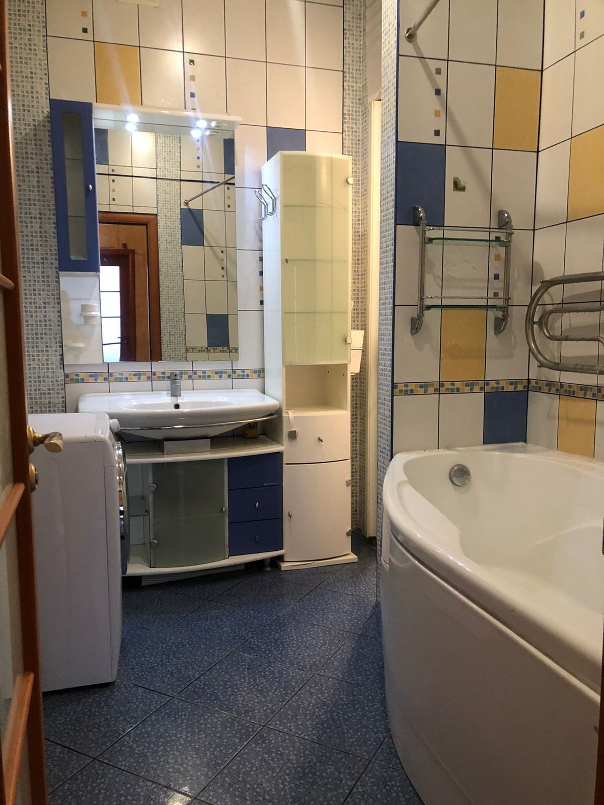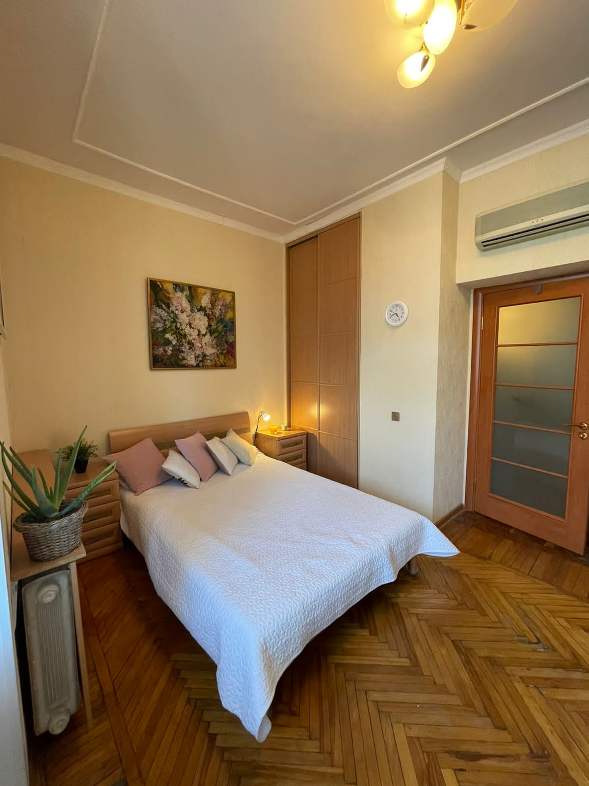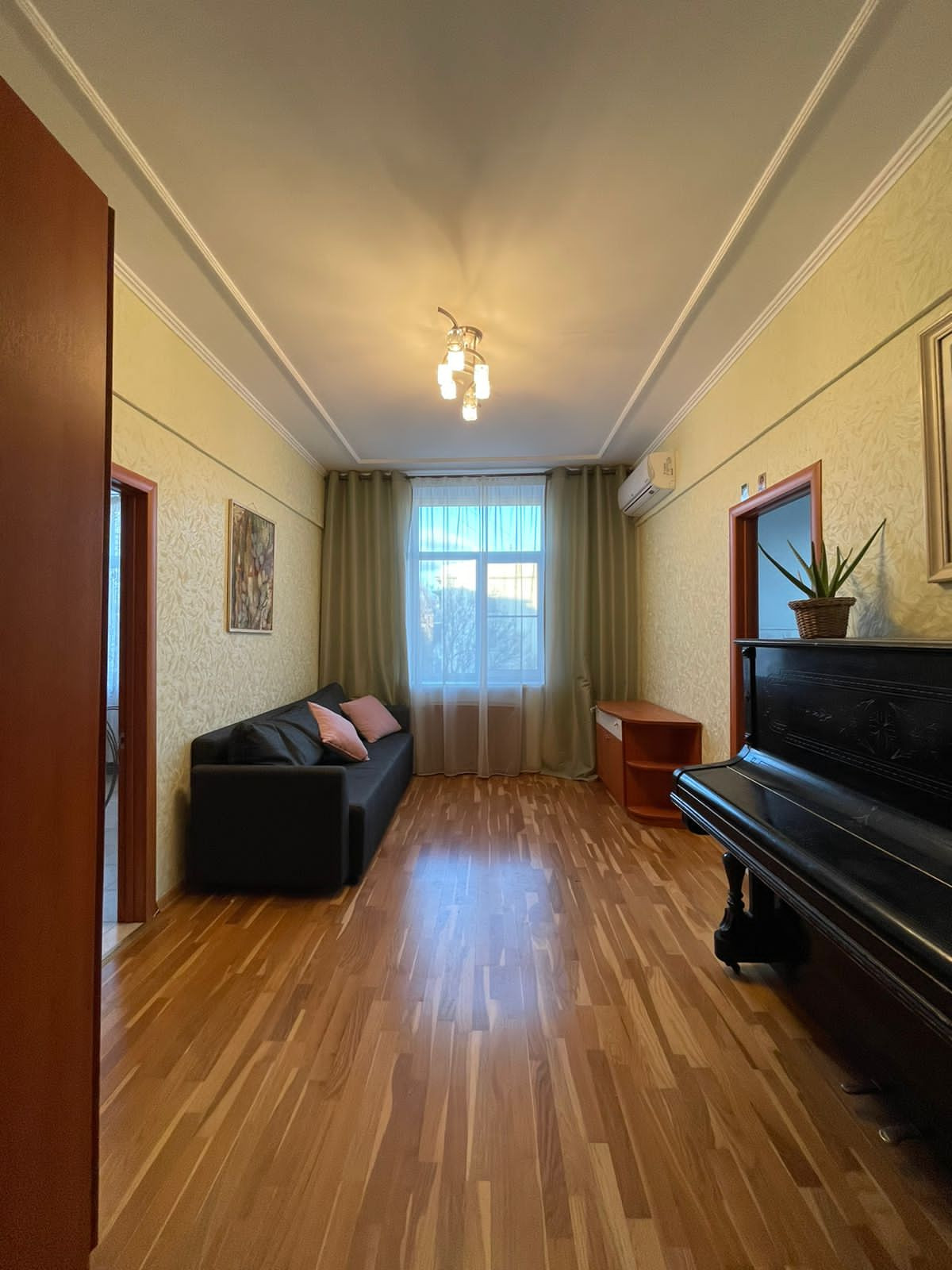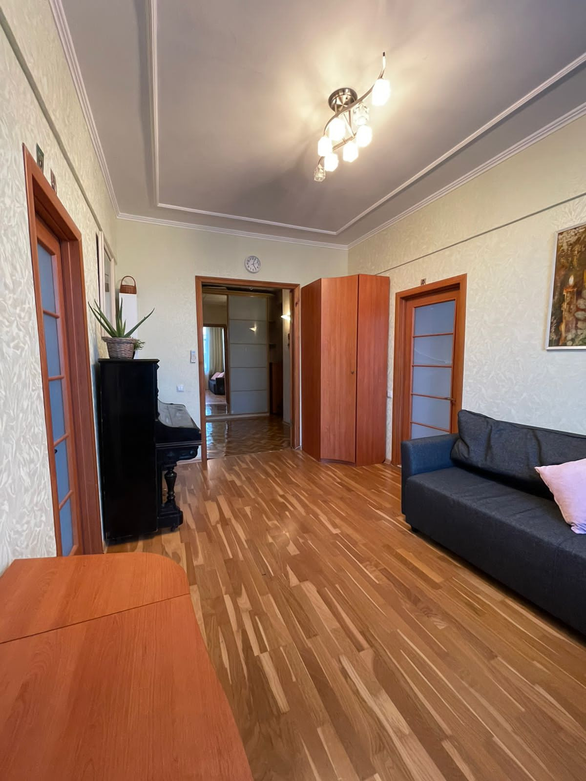 Высокие потолки 3 метра, просторная кухня и большой санузел с ванной и стиральной машиной. Кухонный гарнитур с посудомоечной машиной, газовая плита, микроволновая печь, двухстворчатый холодильник side-by-side. Большой холл оборудован шкафами-купе. В зале старинное пианино. В спальне 2 шкафа-купе, через распашные двери выход на остекленный балкон с панорамным видом. Во второй спальне оборудована детская комната - кабинет. Пол – паркетная доска и паркет, в ванной - плитка. Окна стеклопластик. В квартире установлено 2 кондиционера. В подъезде кодовый замок, отдельная дверь на этаже.