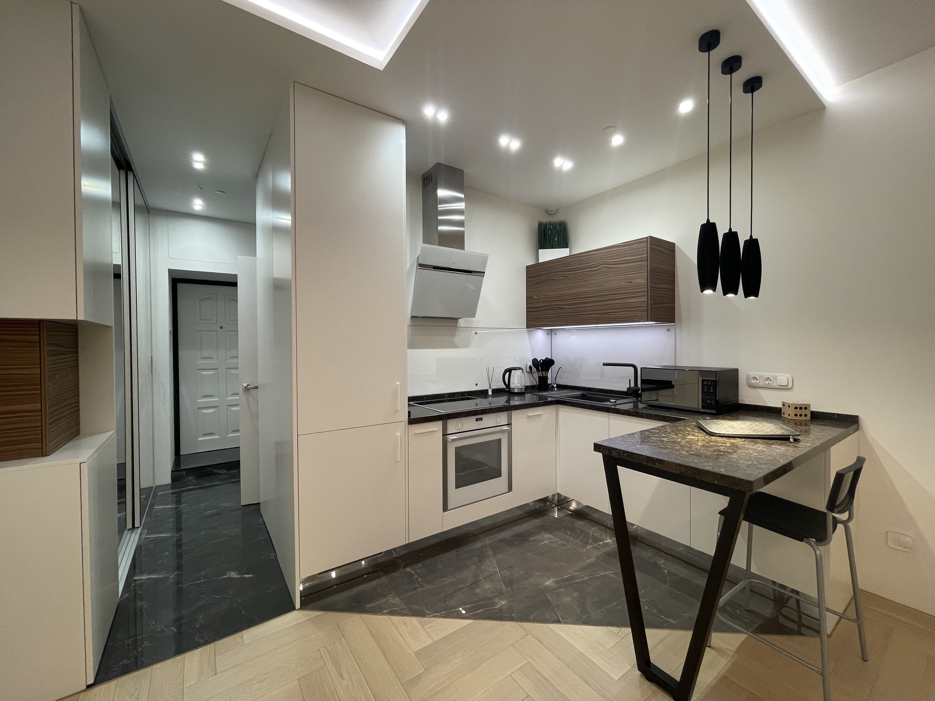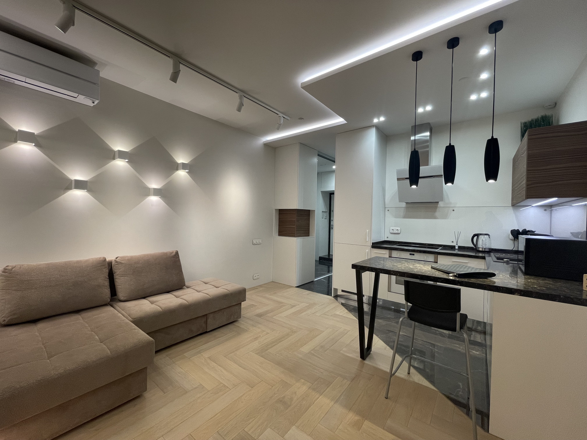 У НАС ОЧЕНЬ ДОРОГОЙ РЕМОНТ. ДЕЛАЛИ ДЛЯ СЕБЯ.       Квартира полностью и качественно меблирована и оборудована техникой. Вся техника, в том числе посудомоечная машина - Neff. Фильтр для воды. Кондиционер Mitsubishi. Везде установлена система подогрева полов. Диван модульный, раскладной. Матрас Аскона. Освещение многоуровневое (тёплый и холодный свет). Пылесос Dyson. Вся сантехника немецкая. Для безопасности установлена сигнализация Гольфстрим. Видеонаблюдение на этаж.