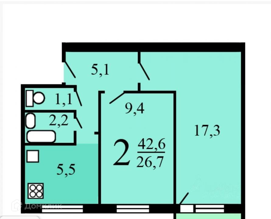 Общая площадь 42.9 м2