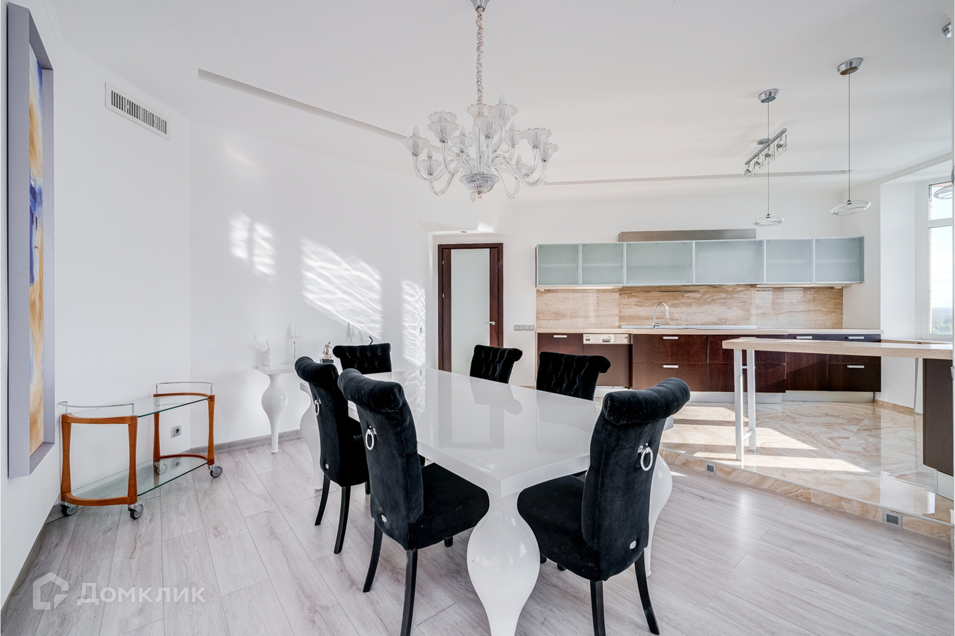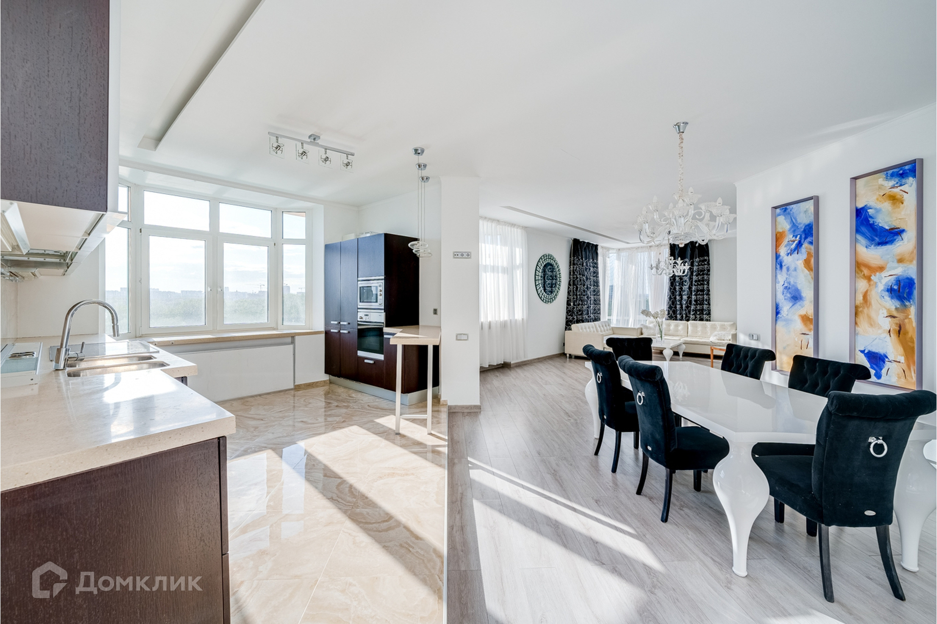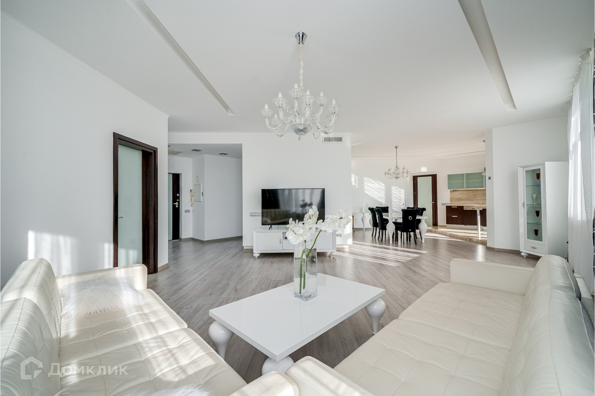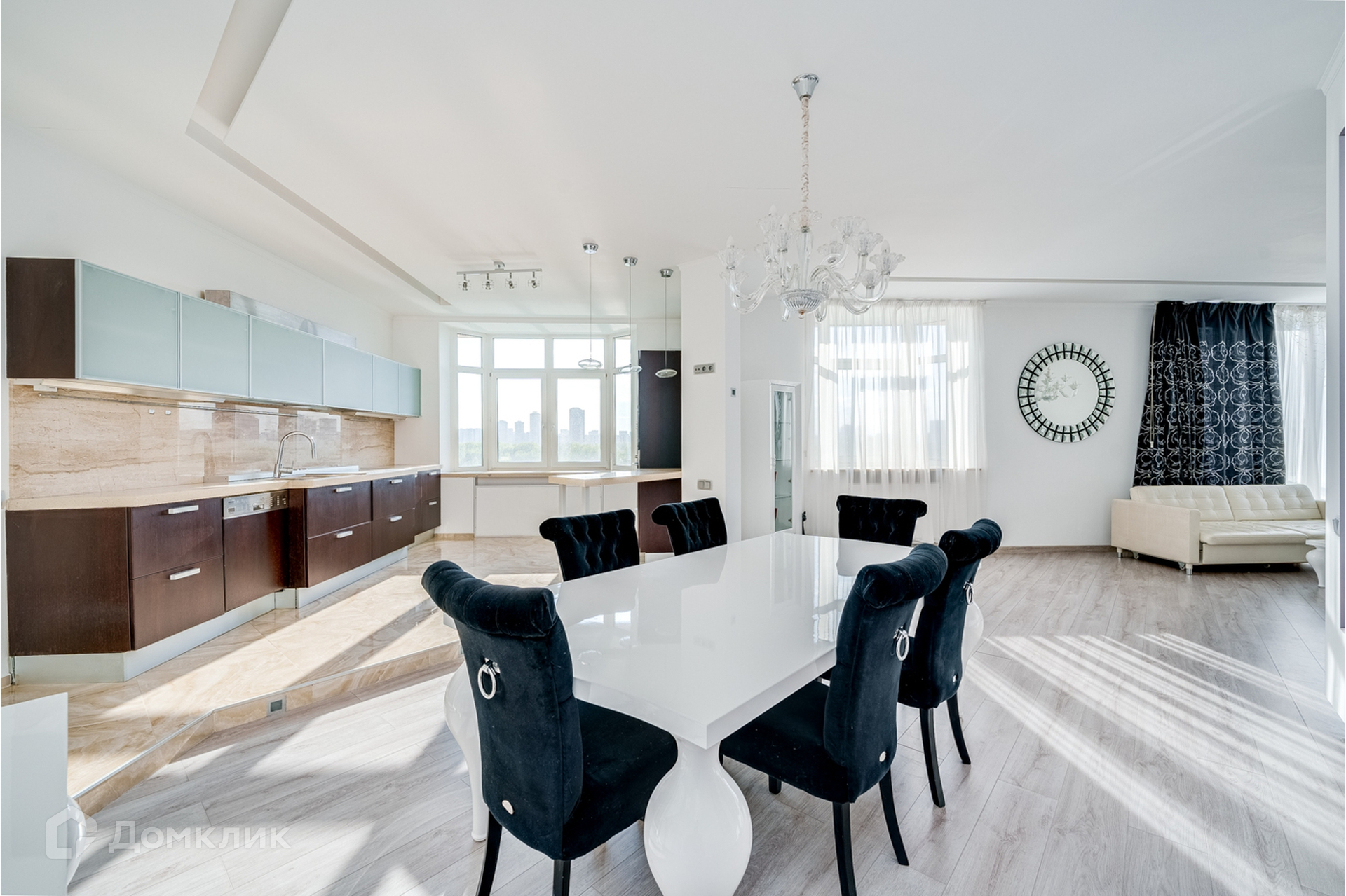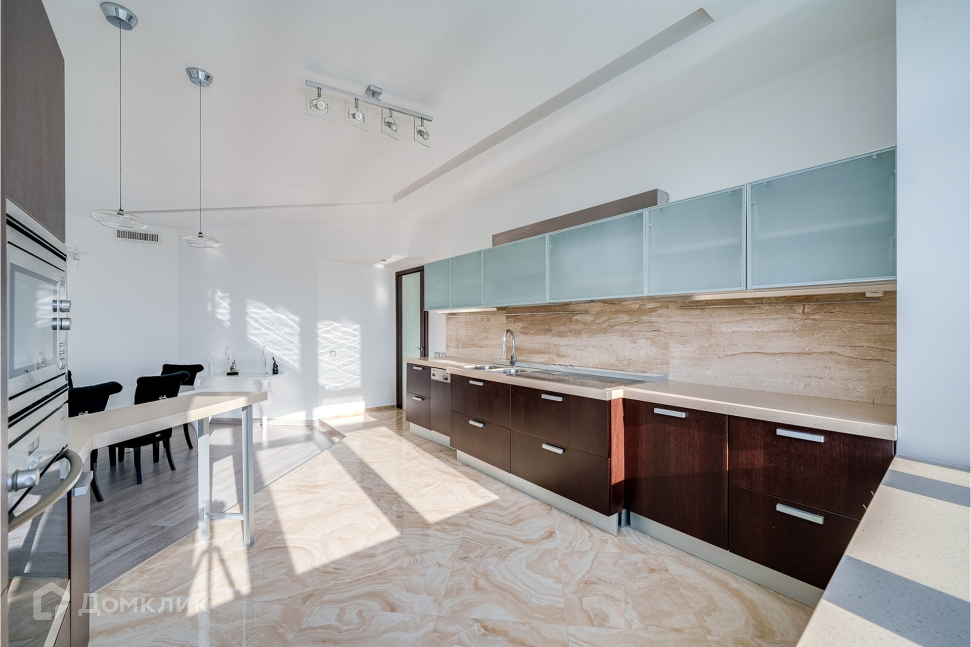 Гостиная и кухня объединены, кухня со встроенной техникой и мебелью, теплым полом, красивой подсветкой потолка, стен и полов.