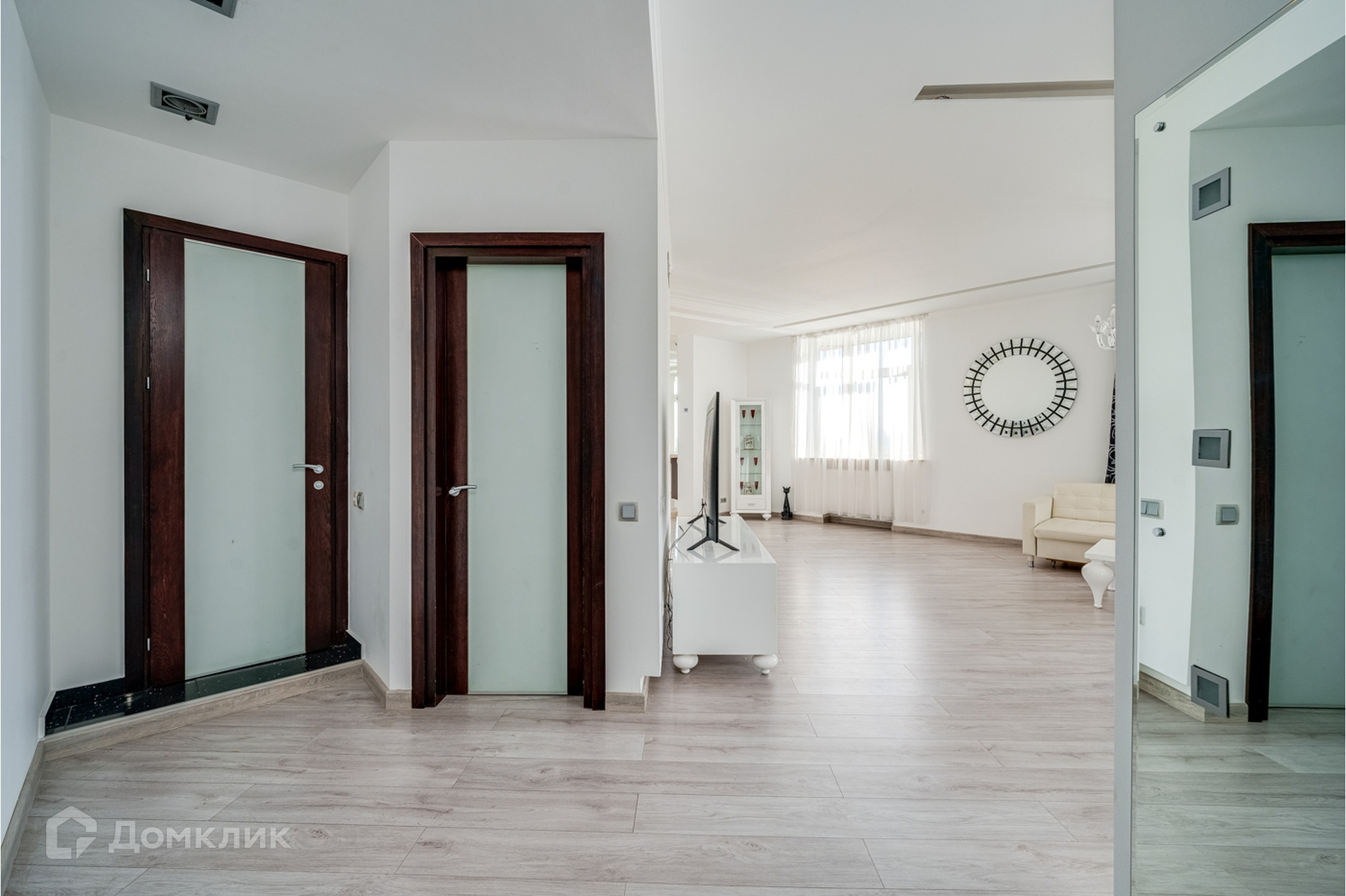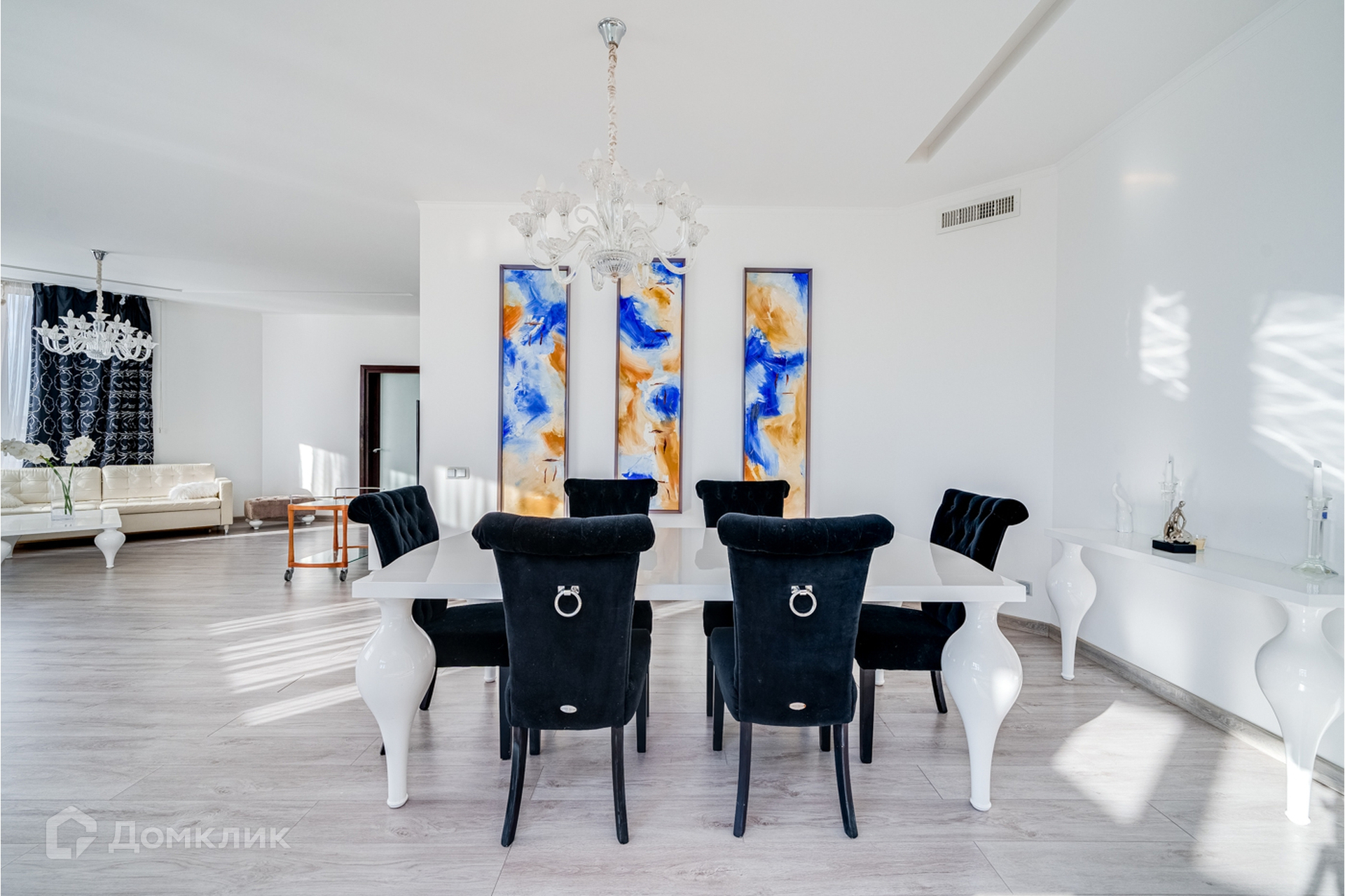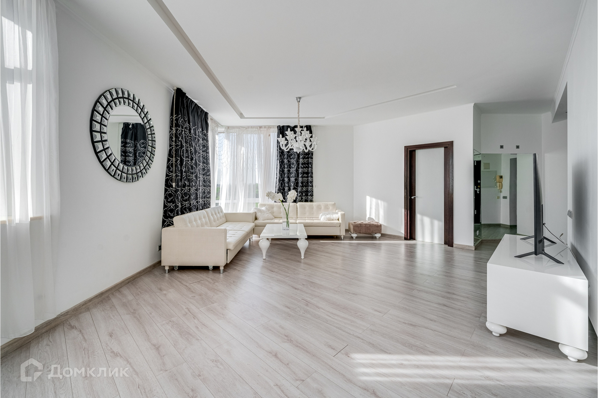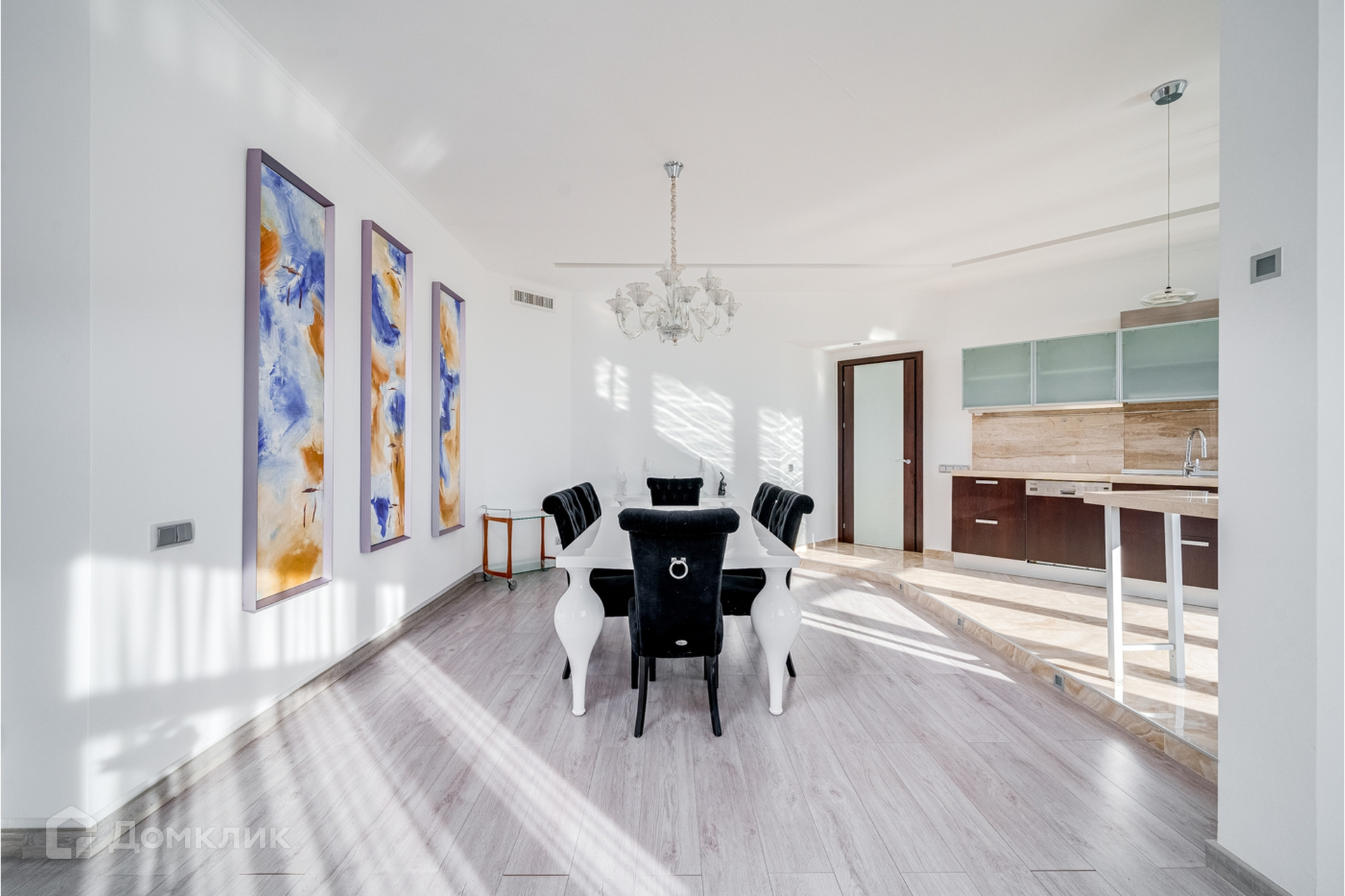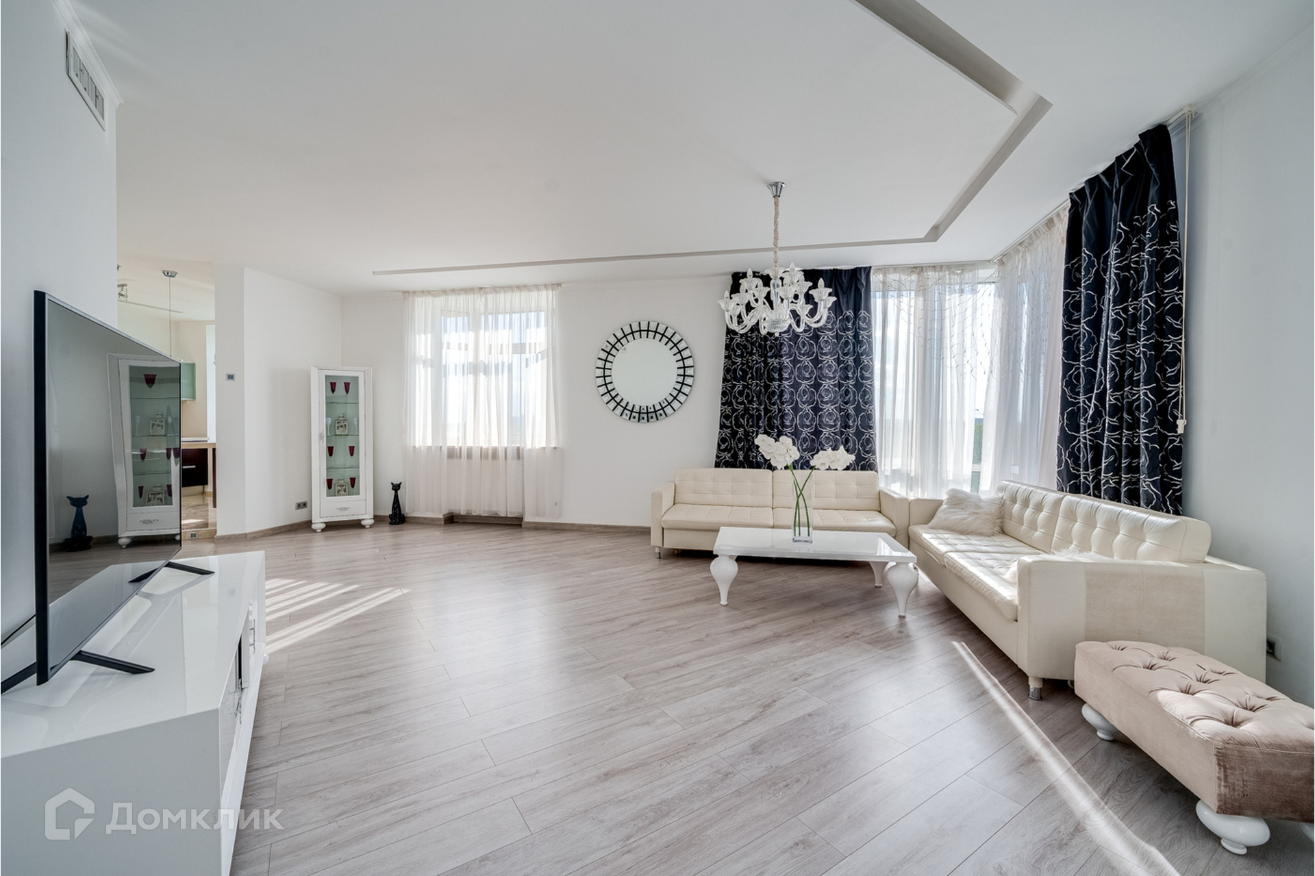 Гостиная и кухня объединены, кухня со встроенной техникой и мебелью, теплым полом, красивой подсветкой потолка, стен и полов.
