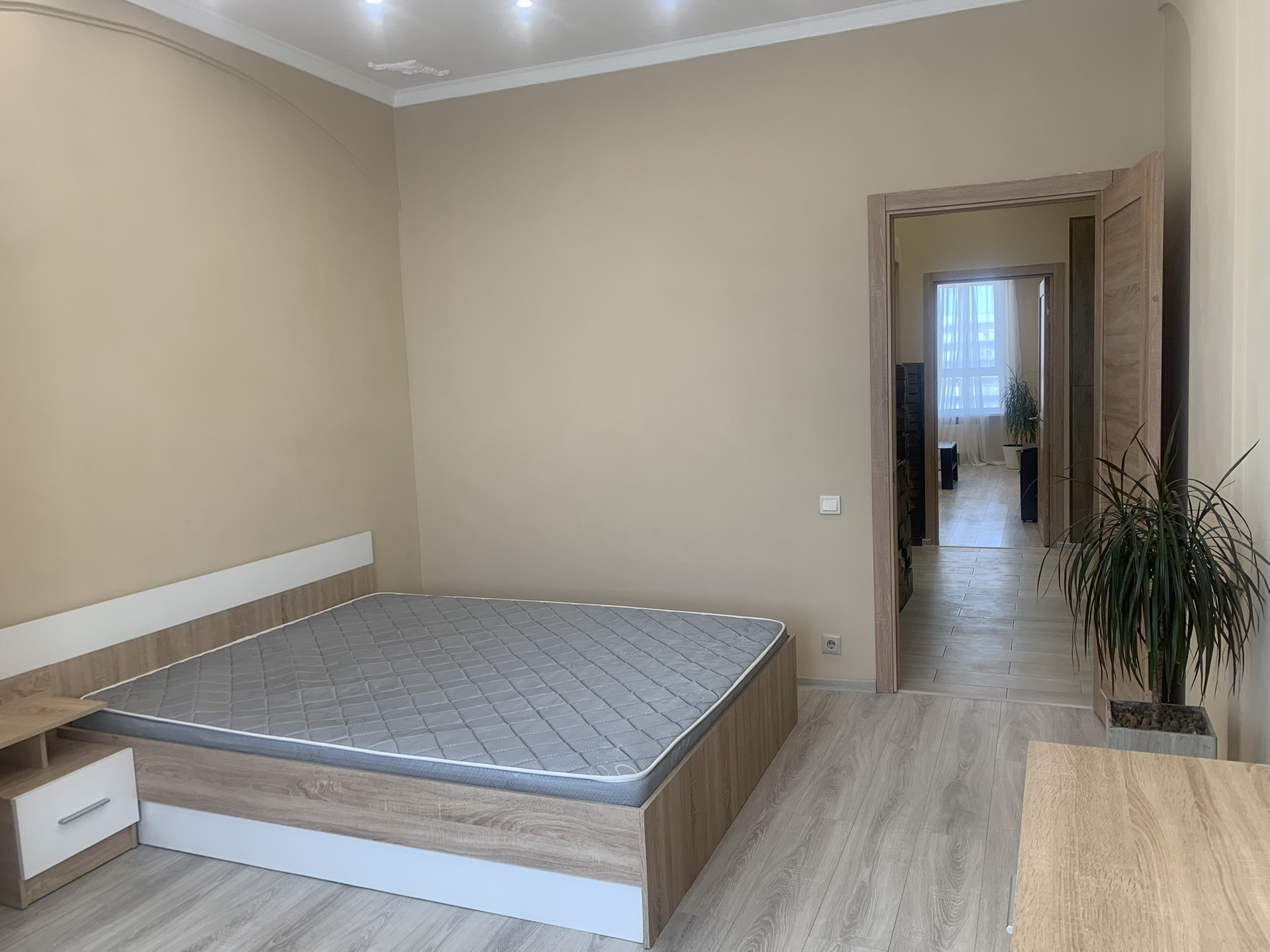 Санузел совмещенный с большой, во всю стену душевой.  Одна из спален с выходом на лоджию.