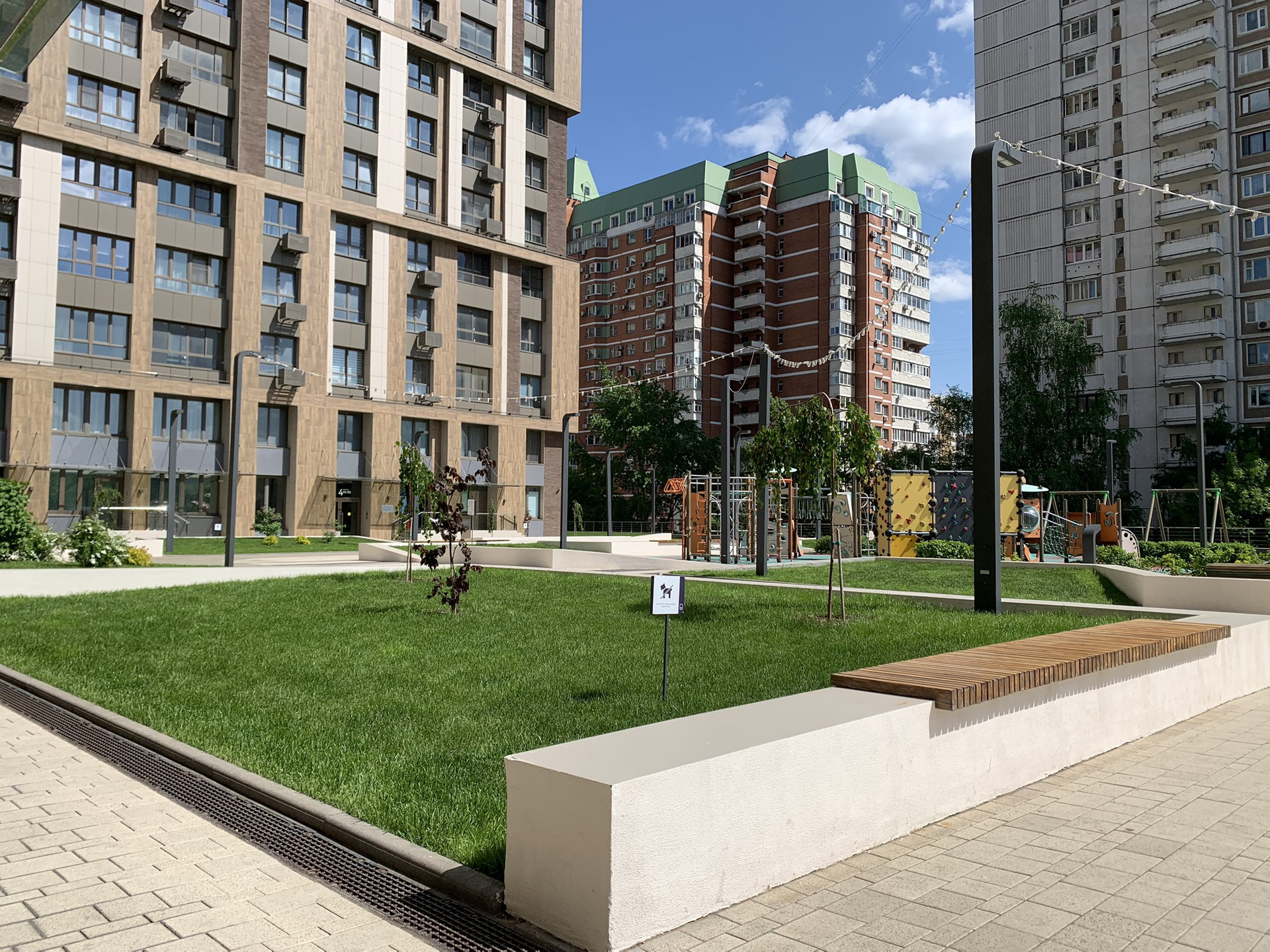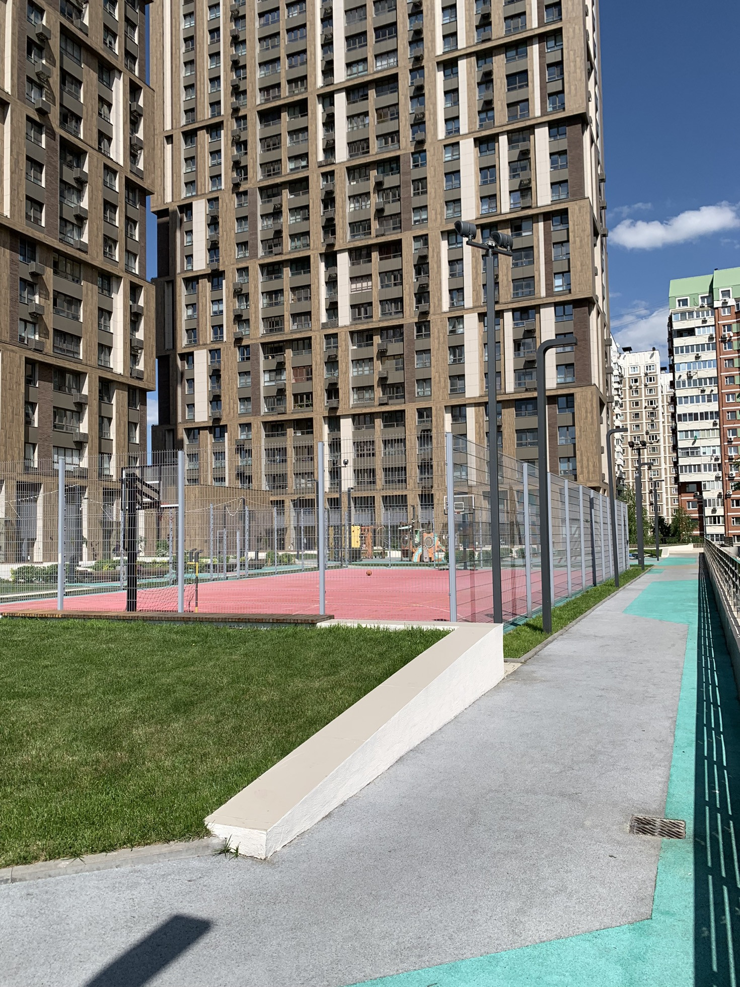 Высокую безопасность обеспечивает круглосуточный 24/7 пост охраны. Территория ЖК закрыта от посторонних глаз.  Зеленый двор с баскетбольной и детской площадками. До метро Озерная 3 мин пешком.