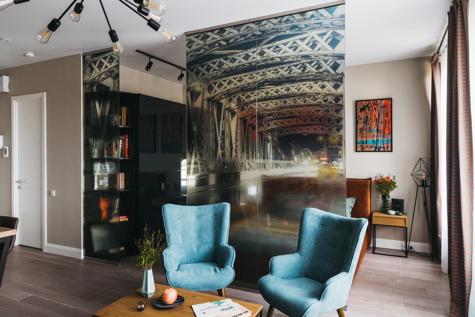 Яркая стильная кухня-гостиная, спальня и просторная гардеробная 5,5 метра с системой хранения.