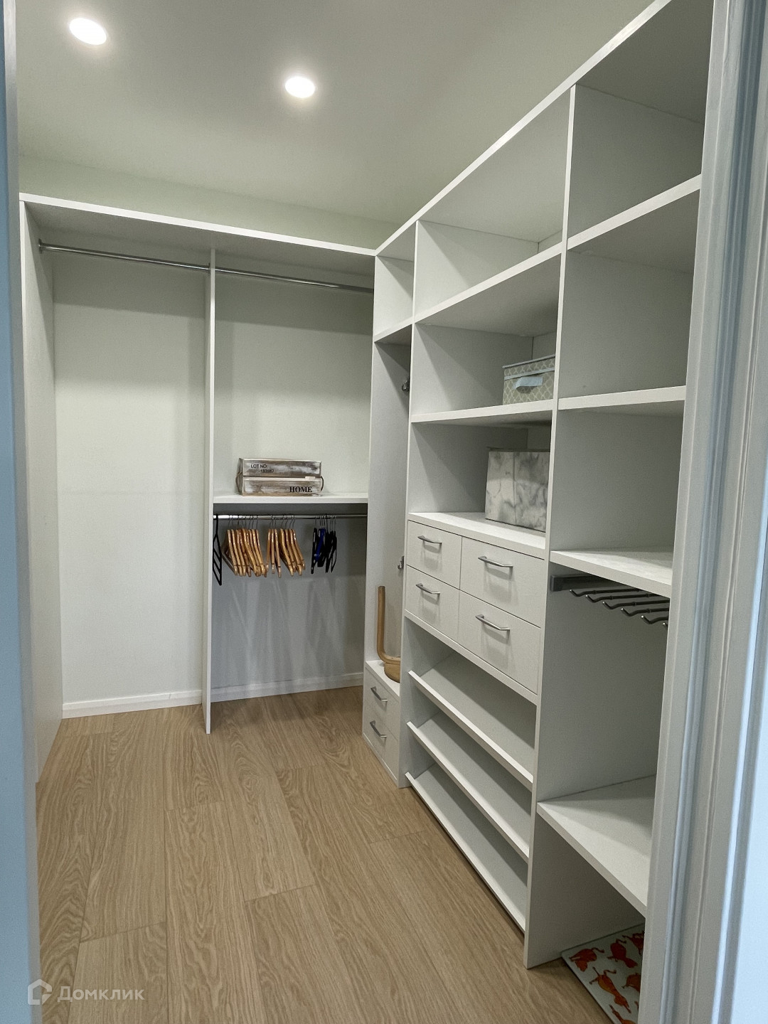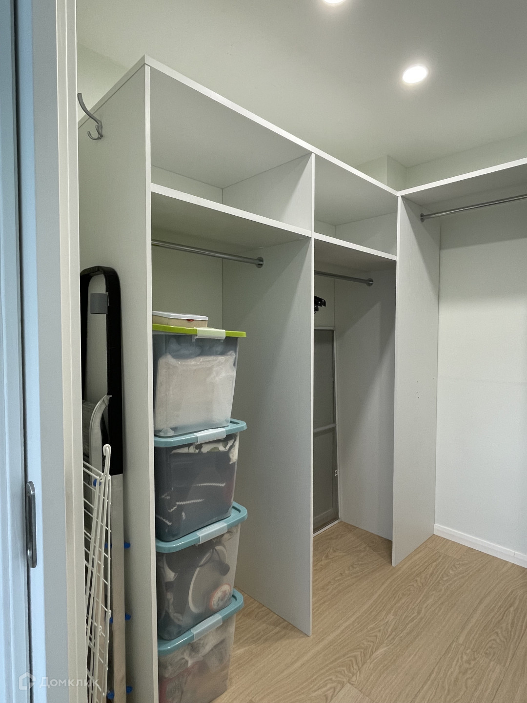 Большая функциональная гардеробная оборудована полками, ящиками и вешалами, она вмещает в себя не только одежду и вещи, но и предметы разного габарите, домашнюю бытовую технику и т.п., что позволяет избежать наличие вещей на открытых пространствах и создает ощущение чистоты и порядка.