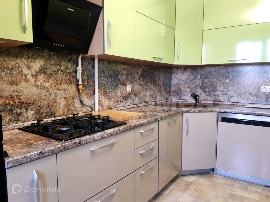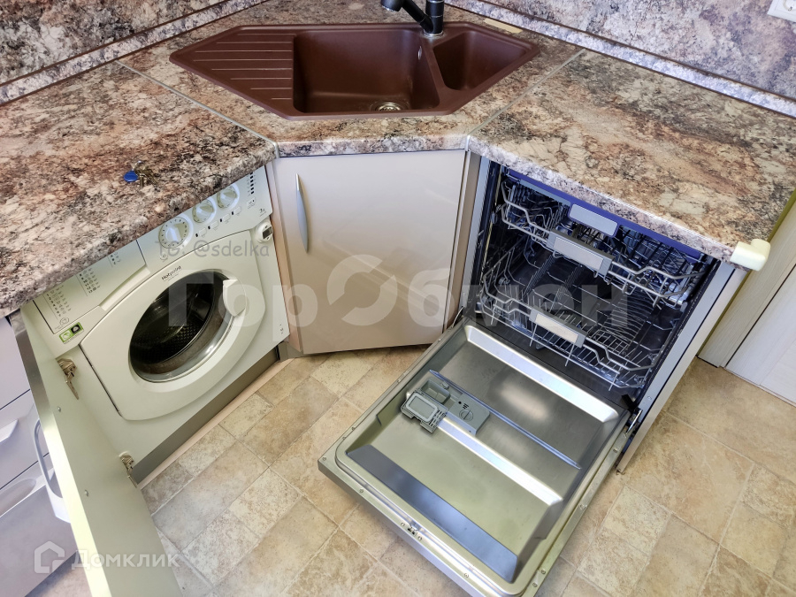 Бытовая техника: плита, духовка, вытяжка, холодильник, посудомоечная машина, микроволновая печь, стиральная машина.