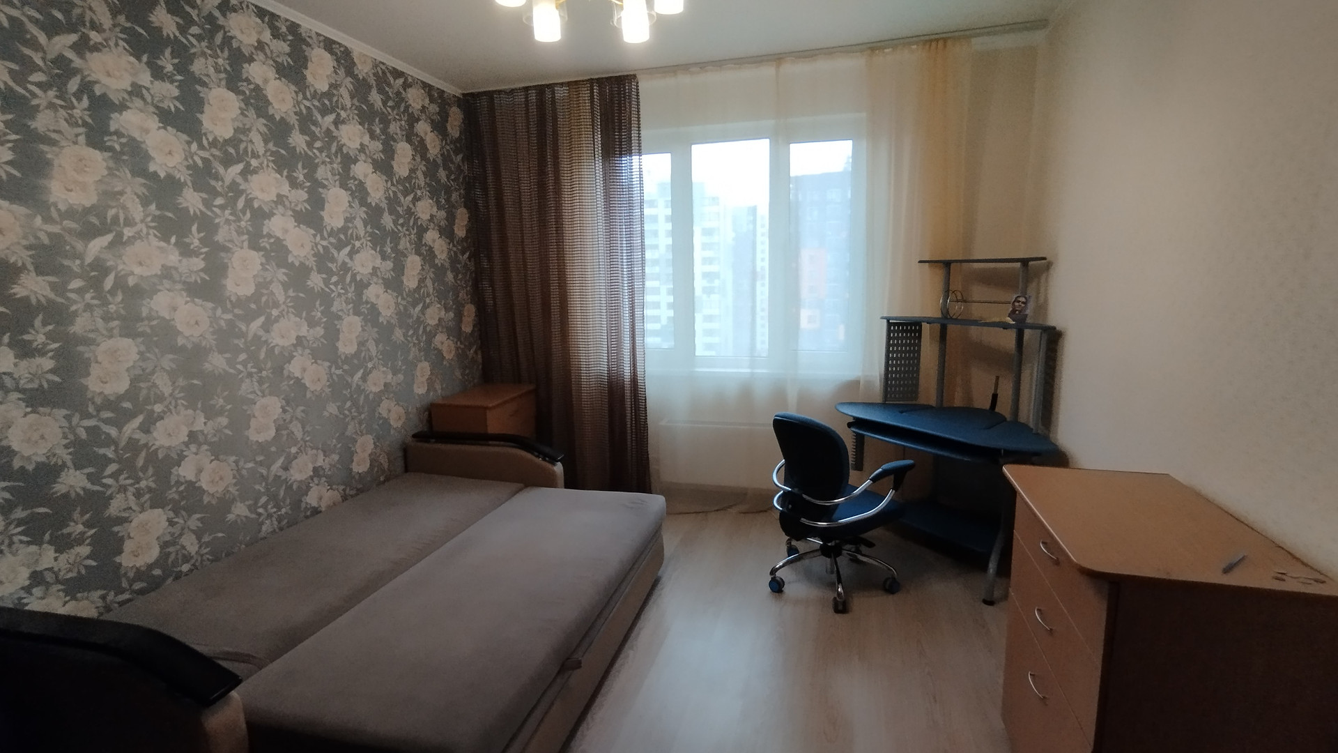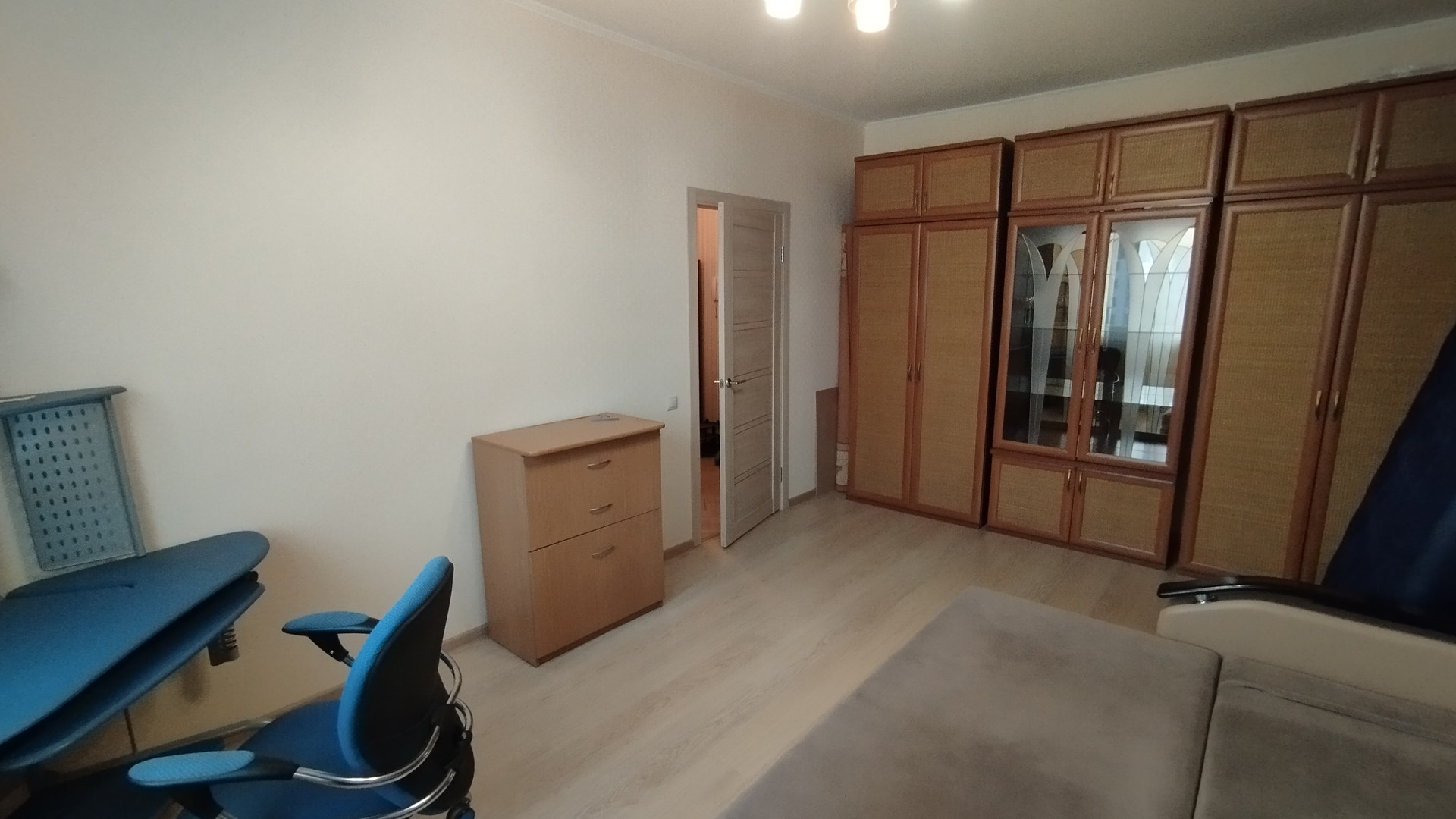В комнате - шкафы, компьютерный стол и стул, диван.