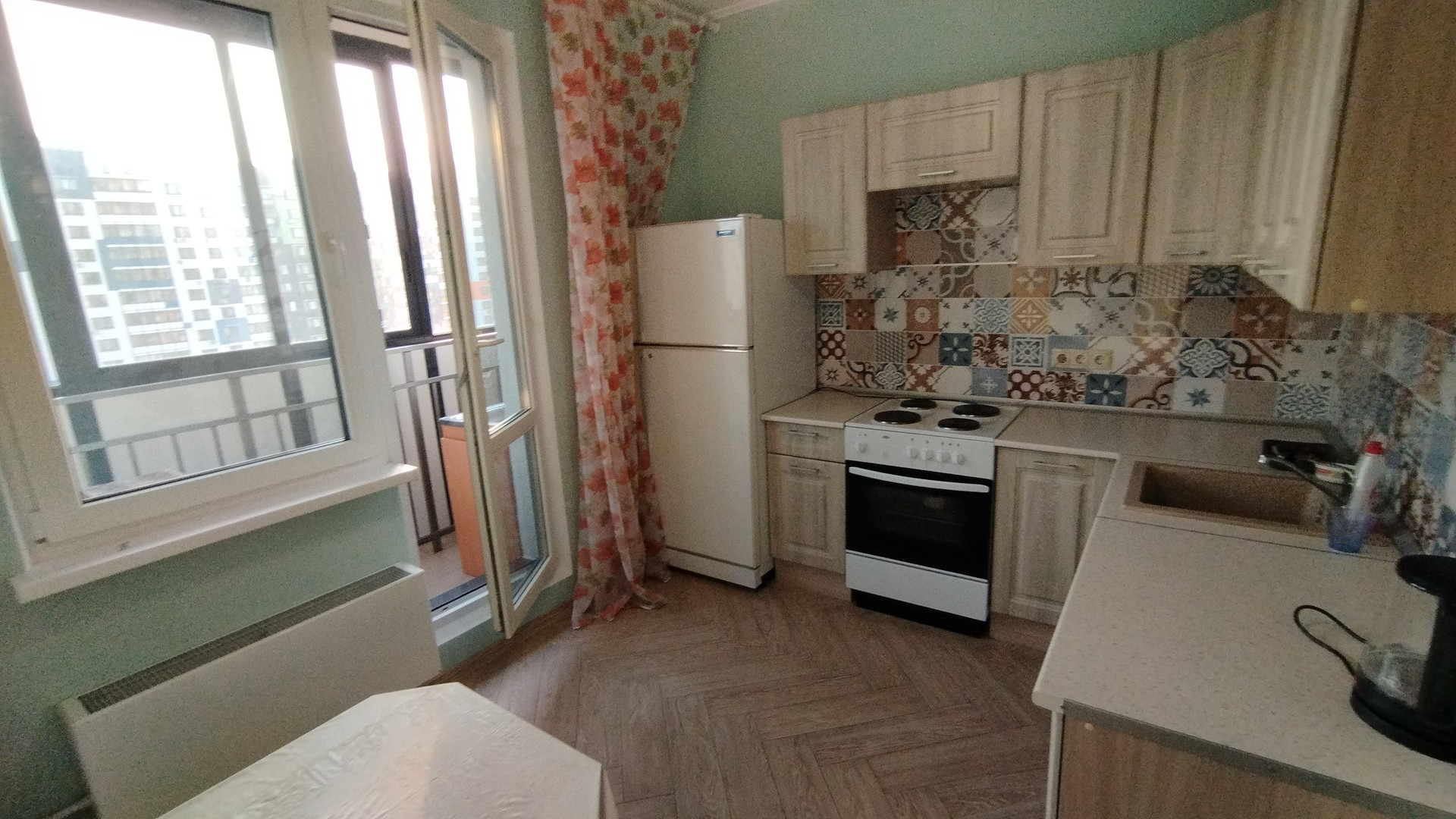 На кухне: холодильник, модульная кухня под единую столешницу, холодильник. На кухне лоджия.