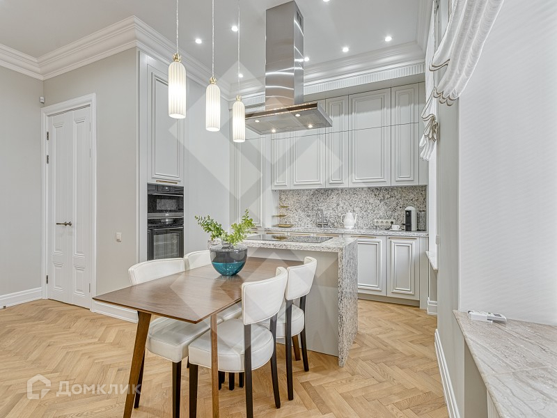Кухня укомплектована варочной панелью, духовым шкафом, СВЧ печью, посудомоечной машиной, холодильником, чайником, кофеваркой, в гостиной телевизор. В интерьере использованы дорогие и качественные предметы мебели (диван Minotti, ковер в гостиной Ted baker, стулья by Filippe Starck).