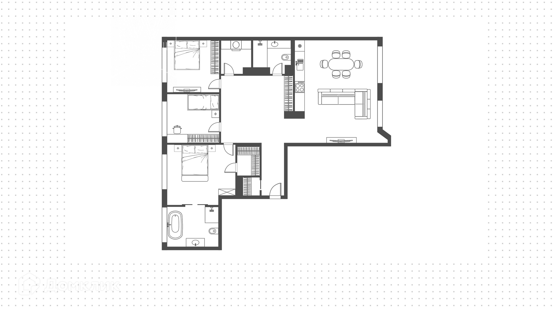 Планировка включает светлую гостиную с обеденным столом и угловым диваном, объединенную с кухней. В кухне установлена встроенная бытовая техника. В мастер-спальне организована персональная гардеробная и санузел. Дополнительно спланировано 2 спальни, санузлы, холл. Апартаменты укомплектованы итальянской эксклюзивной мебелью. Из окон открывается вид на внутренний двор. Два машиноместа в подземном паркинге входят в стоимость аренды.