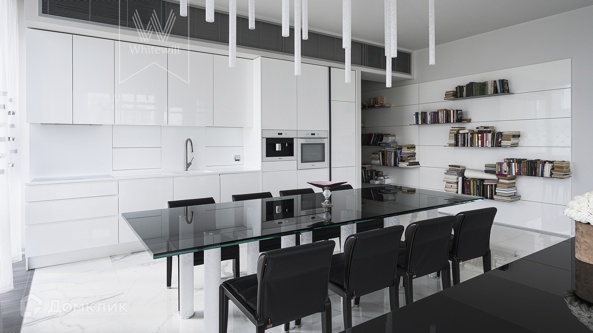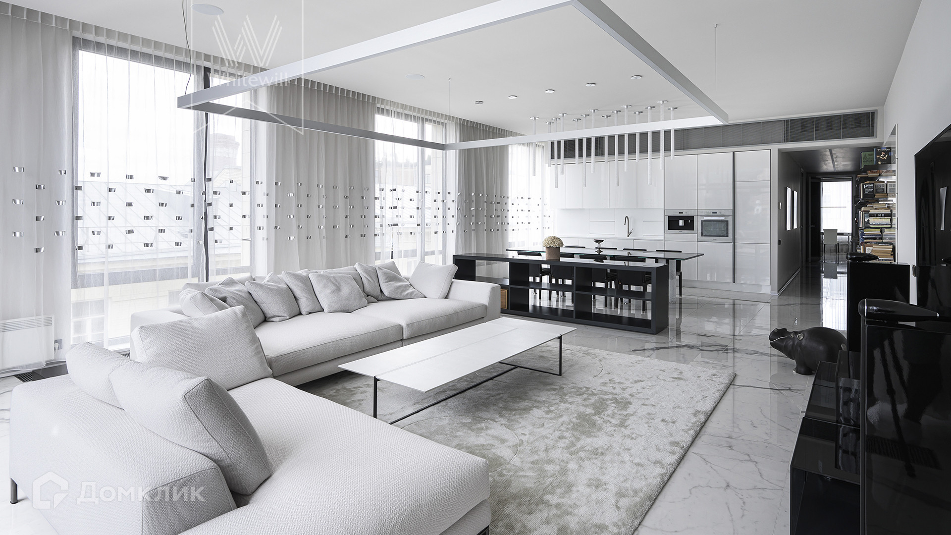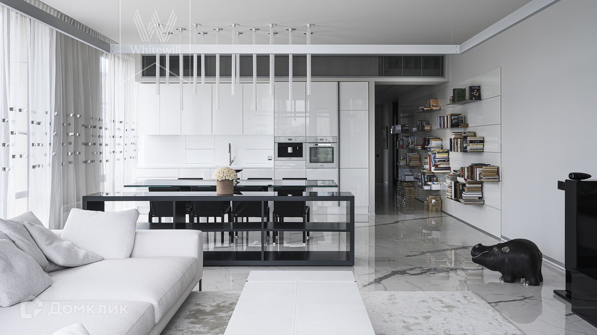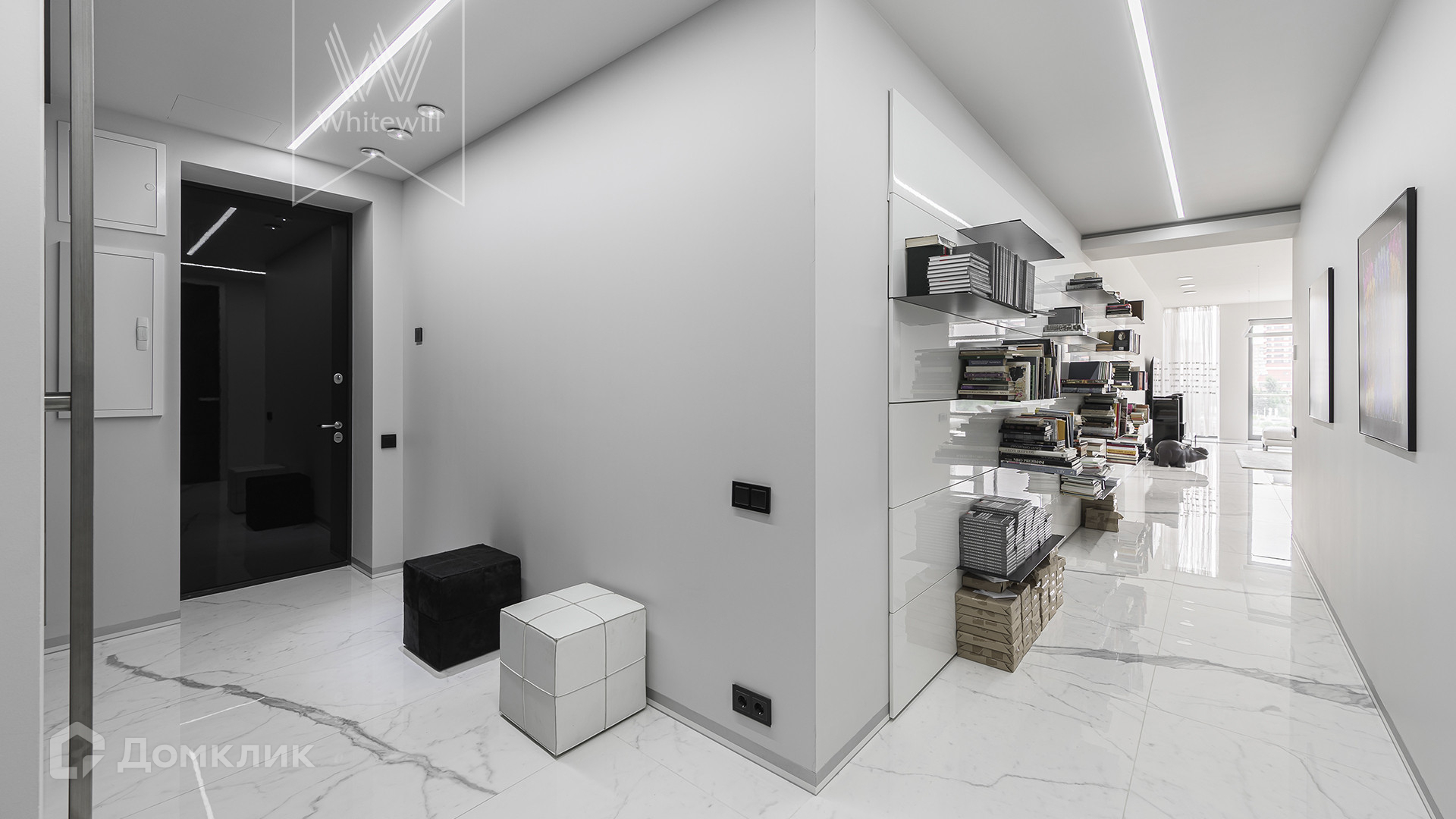 Квартира полностью укомплектована мебелью итальянских брендов, основная часть Minotti, Baxter, Poltrona Frau, Lago. Настенные панели с металлическими полками для книг бренда Porro, стулья для обеденного стола Giorgetti. Итальянские двери Rimadesio.