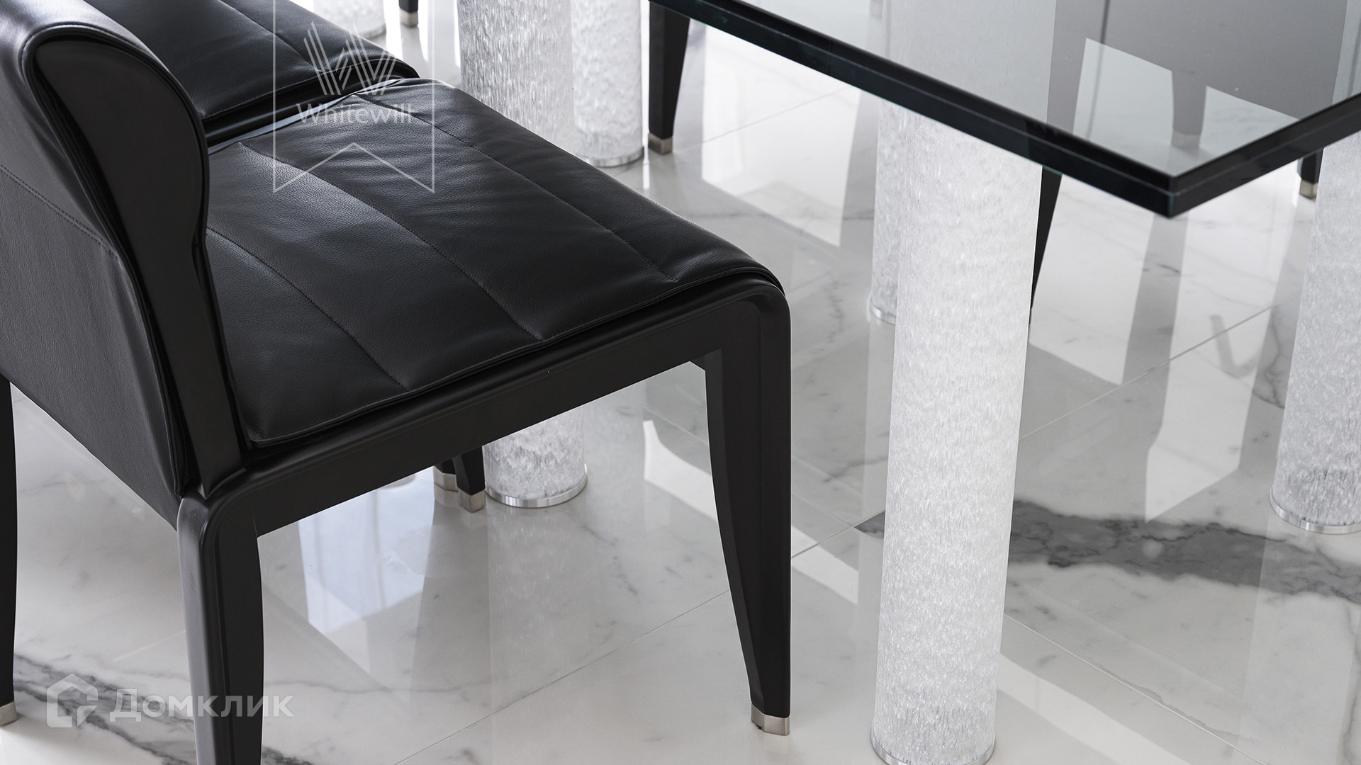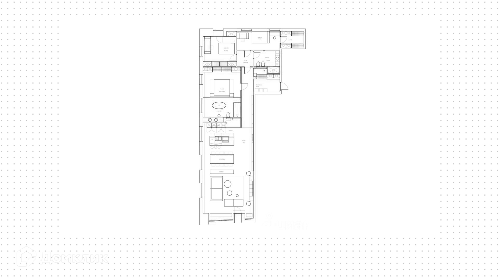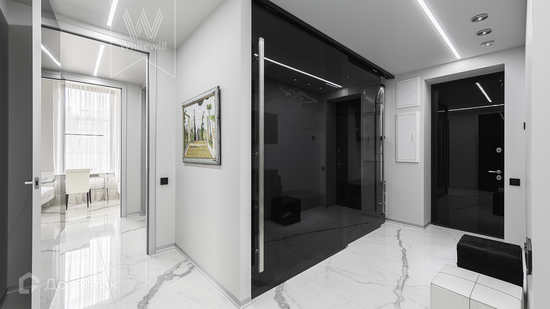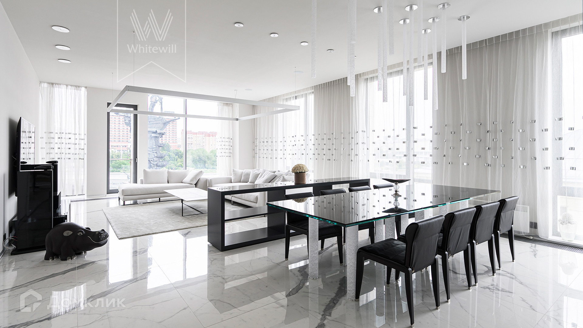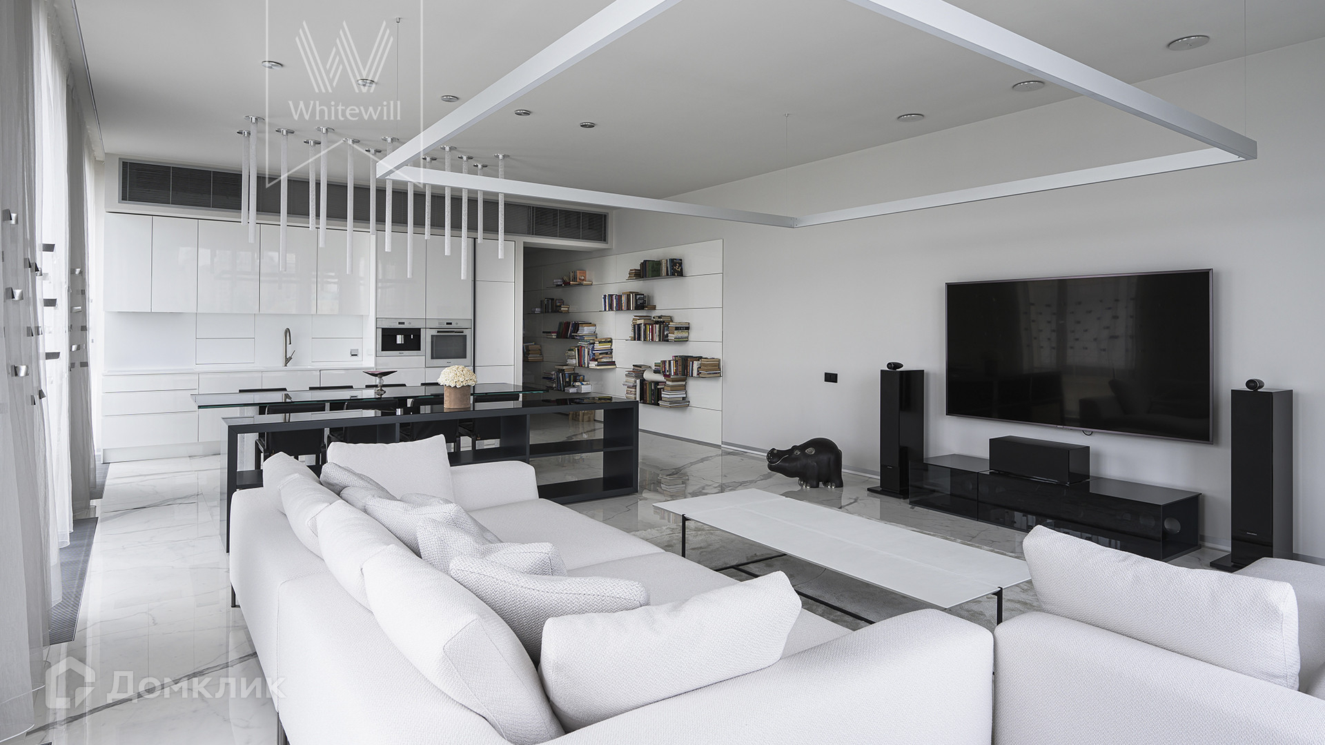 Квартира полностью укомплектована мебелью итальянских брендов, основная часть Minotti, Baxter, Poltrona Frau, Lago. Настенные панели с металлическими полками для книг бренда Porro, стулья для обеденного стола Giorgetti. Итальянские двери Rimadesio.