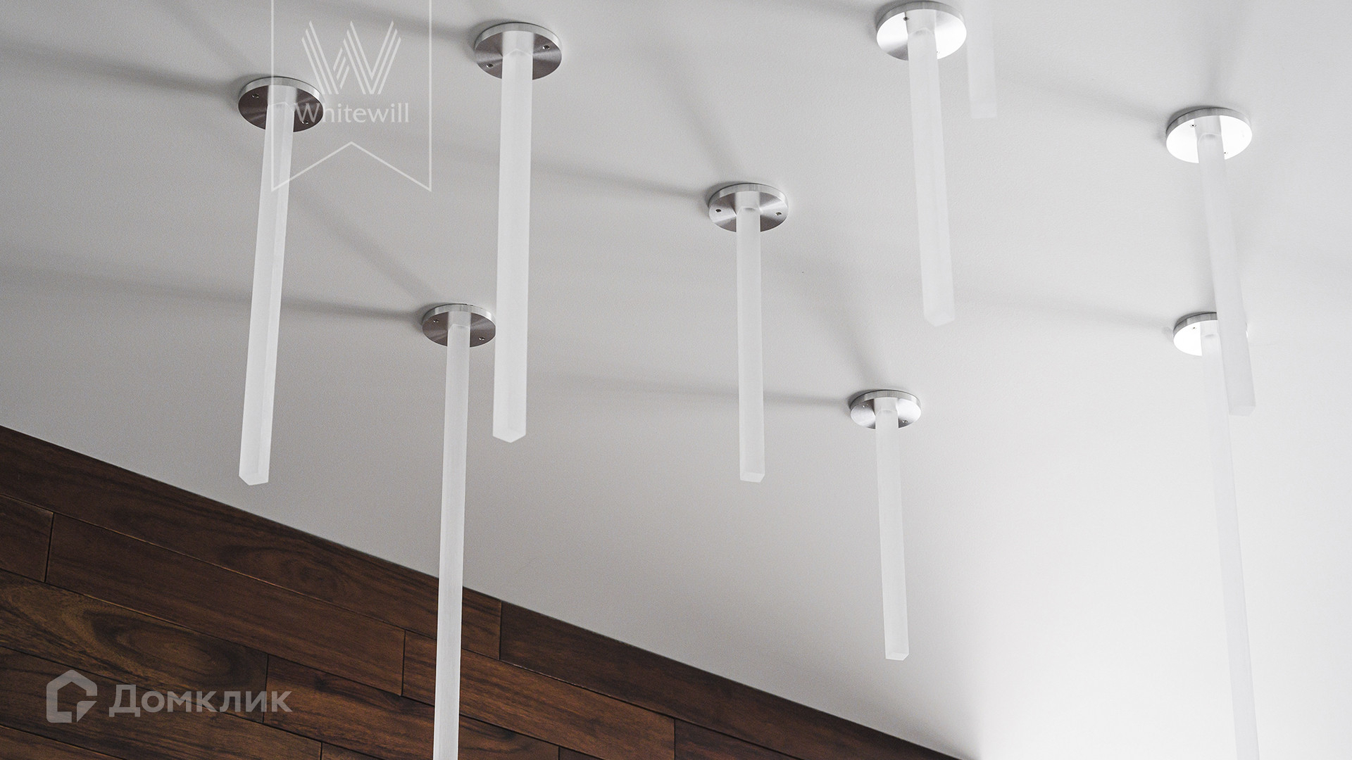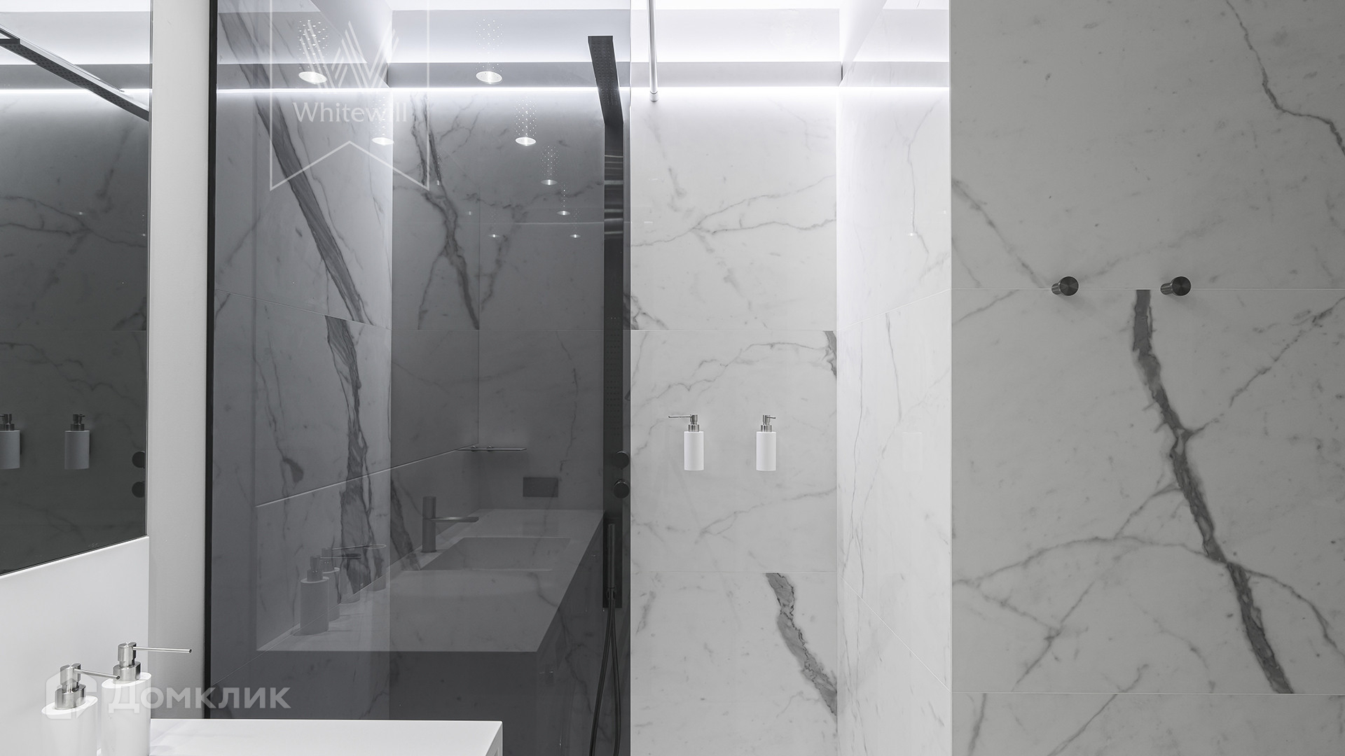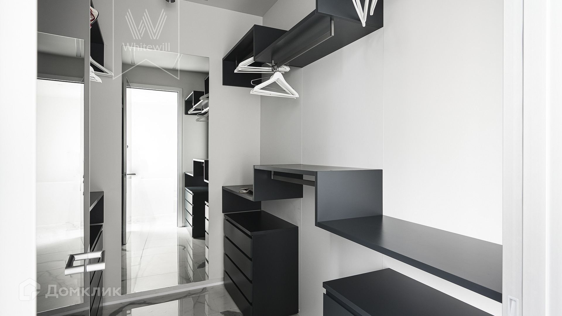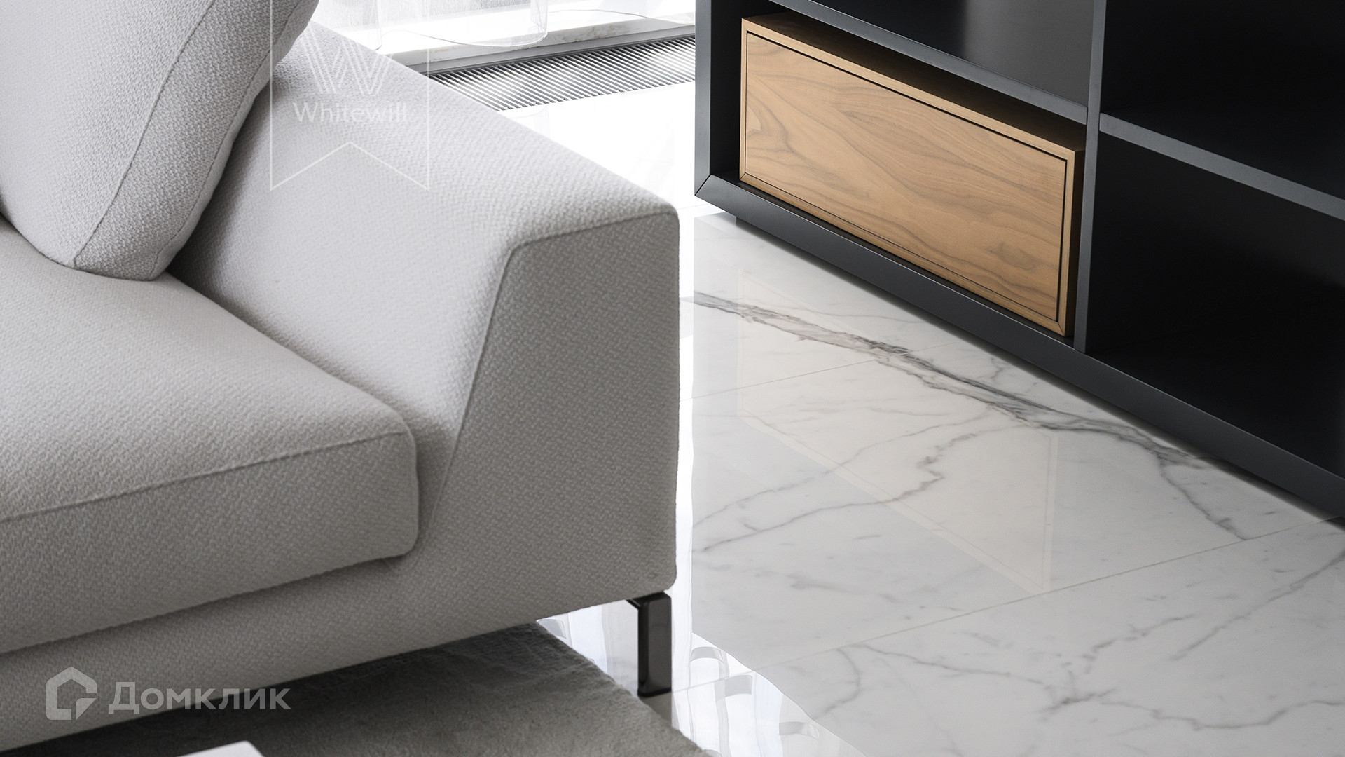 Квартира полностью укомплектована мебелью итальянских брендов, основная часть Minotti, Baxter, Poltrona Frau, Lago. Настенные панели с металлическими полками для книг бренда Porro, стулья для обеденного стола Giorgetti. Итальянские двери Rimadesio.