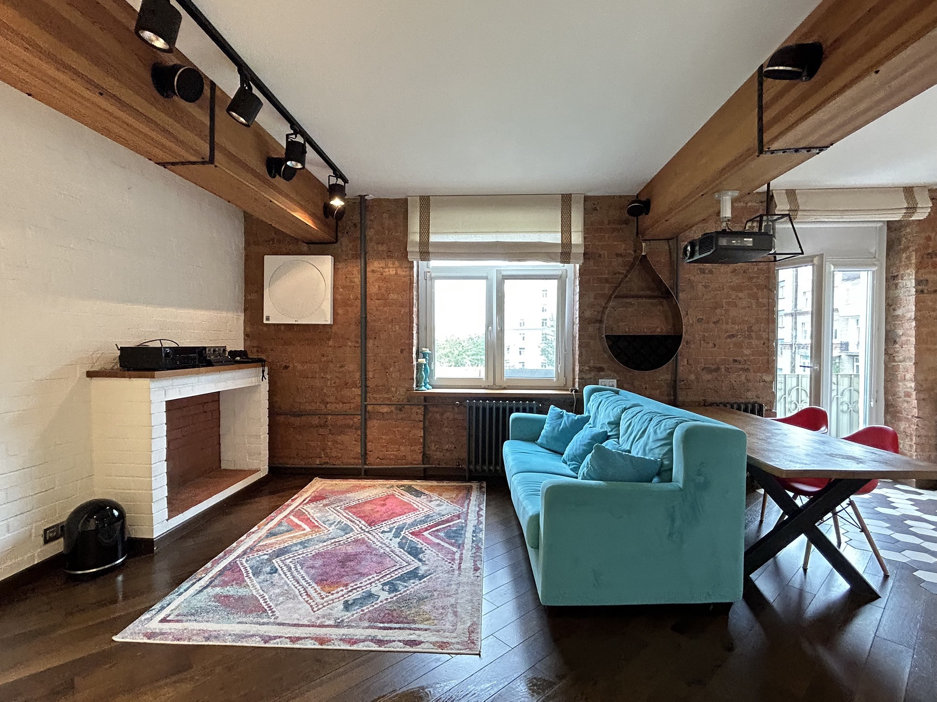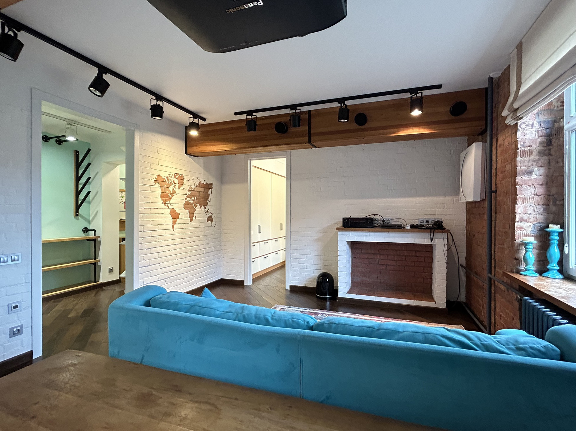 современной мебелью и техникой, камином,