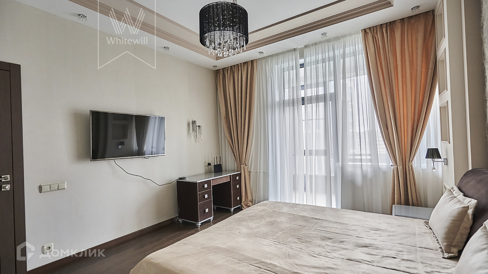 ID 1 483 Просторная квартира с 2-мя спальнями общей площадью 110 м² в доме на Рублёвском шоссе на западе Москвы. Выполнен светлый дизайнерский ремонт в современном стиле. Высота потолков 3,3 метра, большие панорамные окна. Из окон открывается вид на город, в сторону «Москва-Сити».