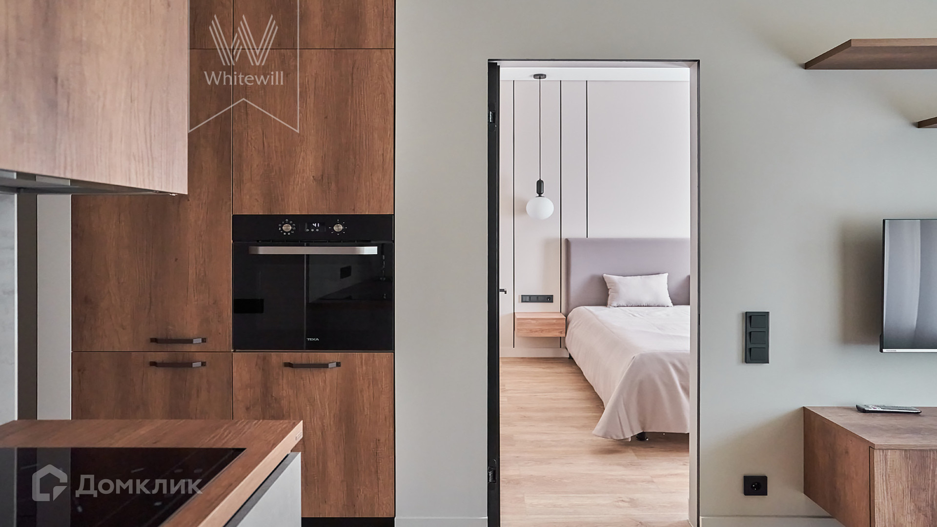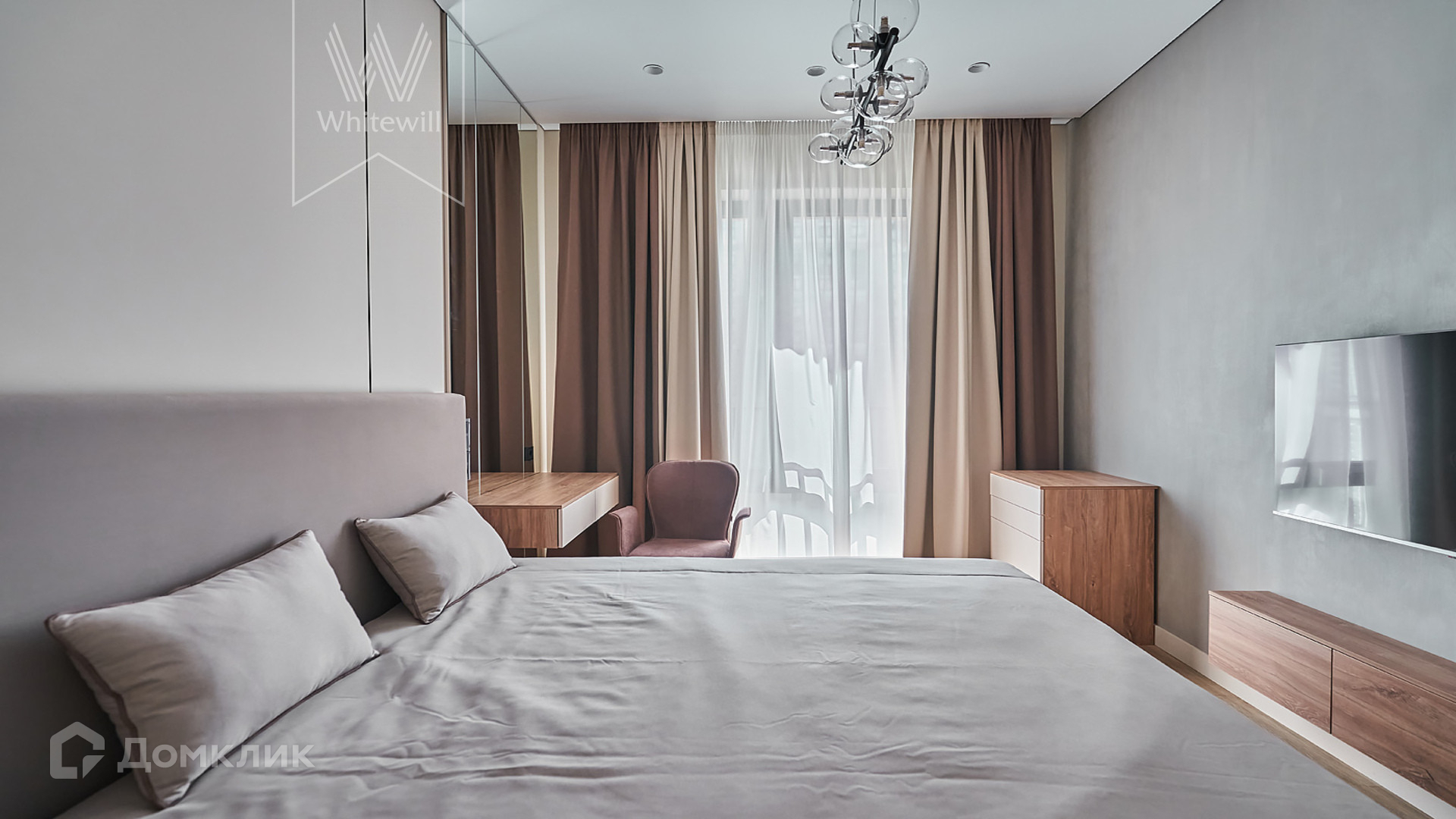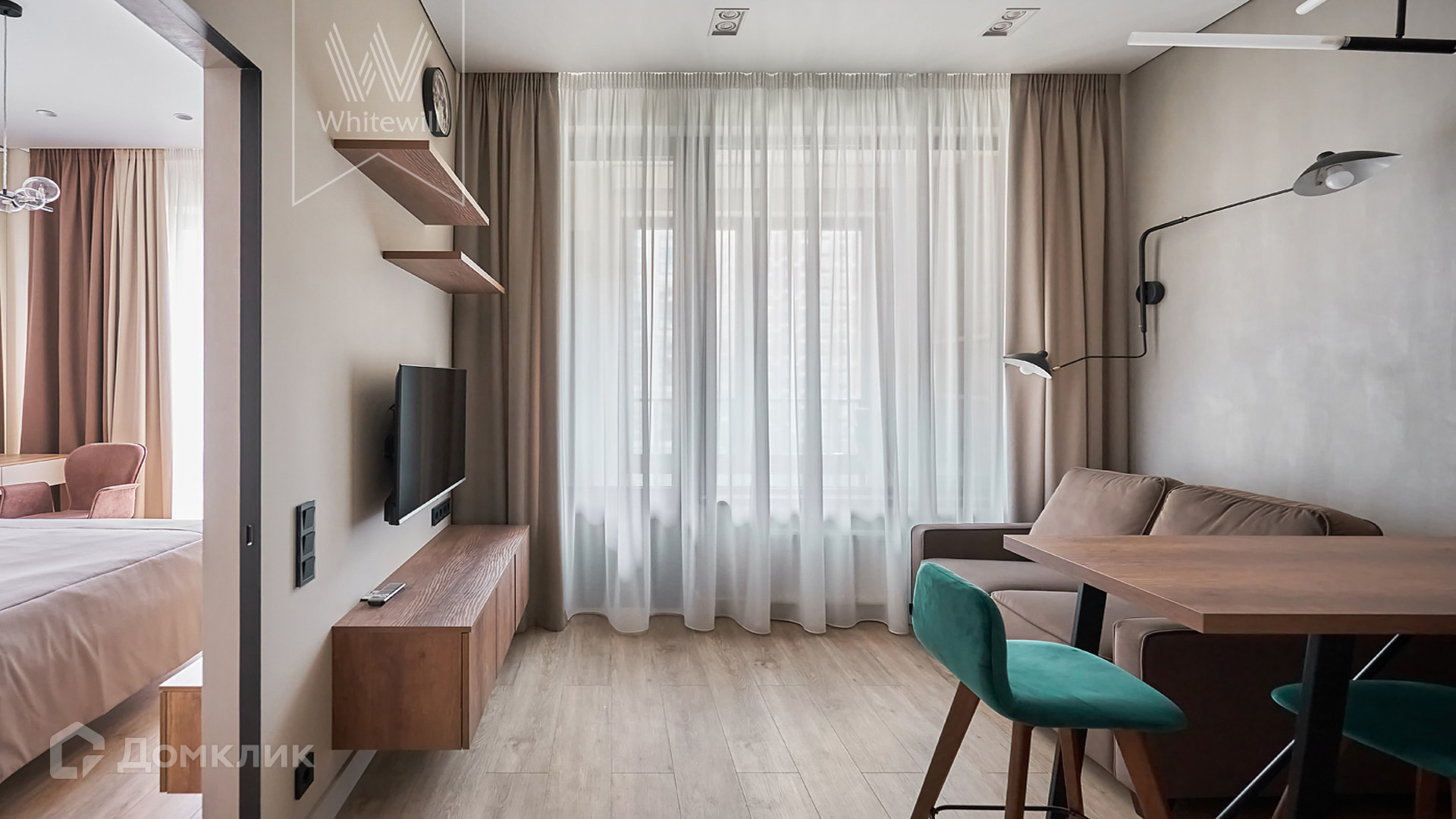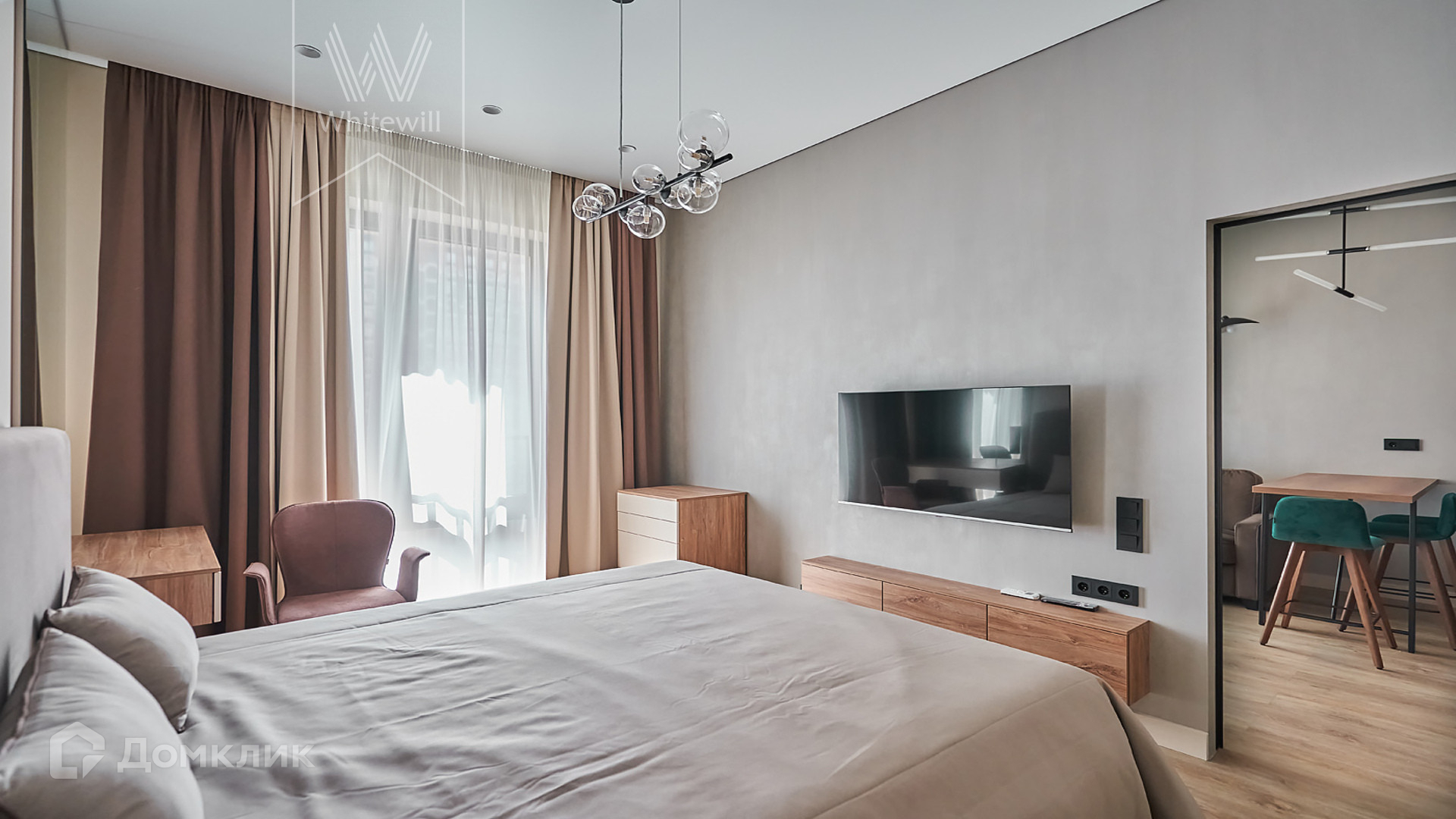 ID 1 680 Апартаменты с 1-й спальней площадью 42 м² находятся на 8 этаже комплекса бизнес-класса «Серебряный фонтан». Внутри выполнен современный дизайнерский ремонт с использованием натурального дерева. В апартаментах спланирована уютная кухня-гостиная с панорамным окном и имитацией французского балкона. В кухне оборудована встроенная бытовая техника. В спальне установлена двуспальная кровать и будуар. Дополнительно оборудована гардеробная и санузел с душевой кабиной. Окна апартаментов выходят на внутреннюю территорию.