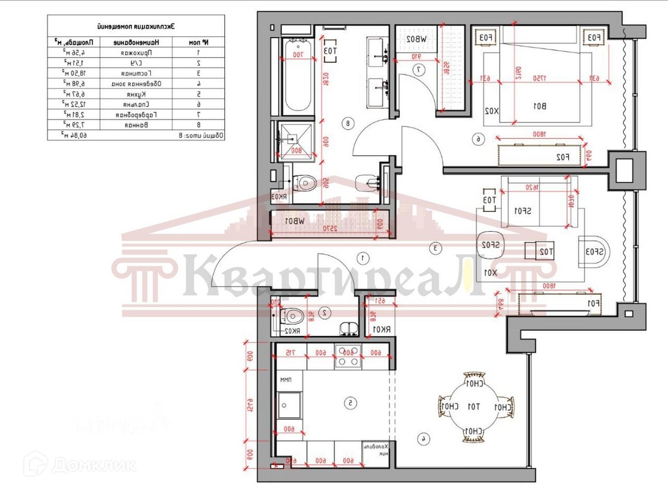 Общая площадь 60.84 м2