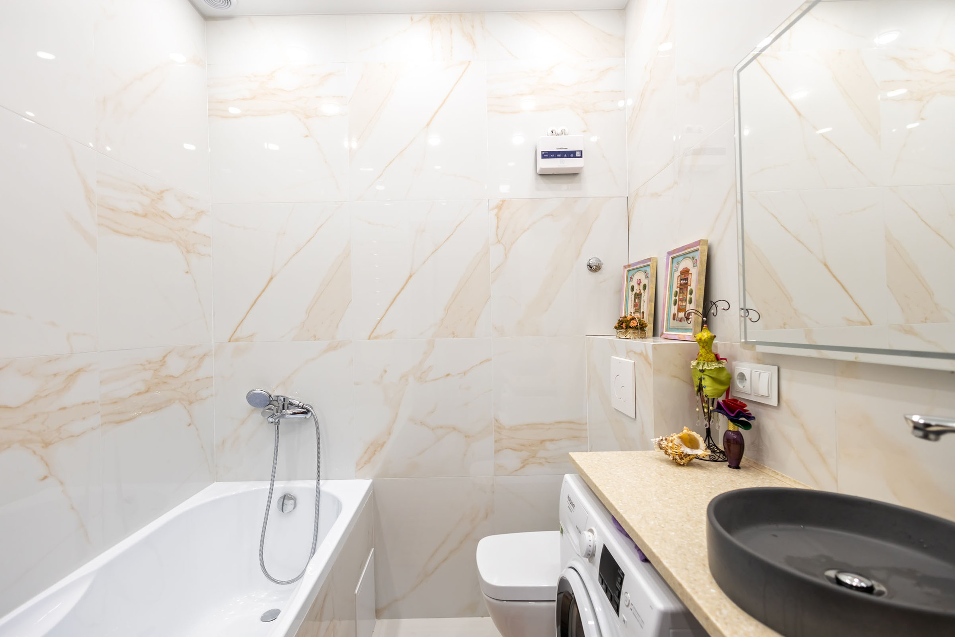Брендовая техника KUPPERSBERG или Whirlpoo, индукционная плита, холодильник, стиральная и посудомоечная машины, телевизор, микроволновая печь. Мебель: кухонный гарнитур с рабочей поверхностью из искусственного камня, обеденный стол, стулья, двуспальная кровать с ортопедическим  итальянским матрасом, стильный диван в гостиной зоне.  Выполнен дизайнерский ремонт. Шкафы органично вписаны в стилистику квартиры. Совмещённый санузел с ванной, электрический полотенце сушитель с выбором температуры, проточный нагреватель с автоматическим включением и выбором температуры, зеркало с подсветкой, вай-фаем, радио и др. штучками. В квартире установлен кондиционер, кварциниловая плитка по всей квартире без стыков и швов. Двери со скрытыми петлями и магнитными замками. Просторная, застекленная лоджия. Окна выходят во двор, высота потолков 3 м ДОПОЛНИТЕЛЬНАЯ ИНФОРМАЦИЯ В квартире подключён интернет. Арендатор может воспользоваться услугами другого провайдера. Установлены счётчики на воду и электричество. Жилец дополнительно оплачивает все к/у по квитанции. Заселиться могут 1-2 чел. Строго славяне или европейцы.