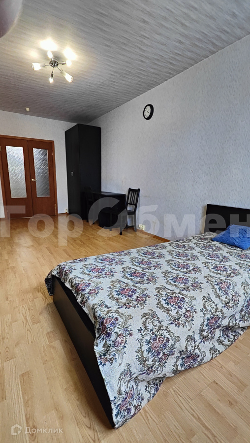 Большая комната с распашными дверьми укомплектована шкафом, столом, тумбой и кровью
