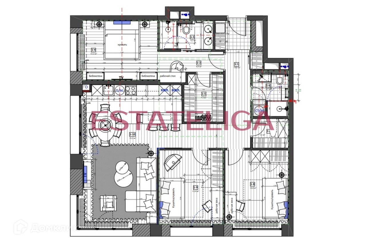 Функциональная планировка квартиры, разработанная по индивидуальному дизайн-проекту: просторная кухня-гостиная (35 кв.м.), мастер-спальня (17 кв.м.) с гардеробной и своим санузлом с душем, две детские комнаты (каждая 14 кв.м.), гостевой санузел/постирочная,  гардеробная/кладовая, просторный холл. Много мест для хранения.