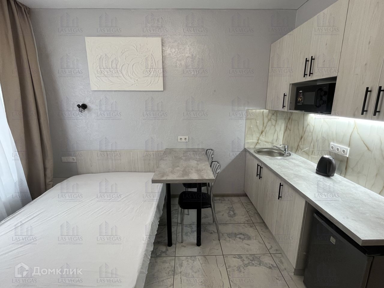 Теплая, светлая и уютная студия. Планировка продумана до мелочей, учтено абсолютно все, что необходимо для комфортного проживания. Большое окно завешивается плотными шторами и декоративной тюлью. Напротив вместительный комод. Широкая кухня с обеденным столом на двоих. Есть плита, холодильник, микроволновка, все необходимые столовые приборы. Большая ванная комната с душевой кабиной, раковиной и стиральной машиной. Вся сантехника, как и ремонт, абсолютно новые. Качественный ремонт и хорошо продуманная эргономика. На небольшом пространстве есть спальня, кухня, обеденная зона, гардеробная, ванная и прихожая. Вся мебель и предметы интерьера тщательно подбирались, чтобы ни одна мелочь не была упущена.