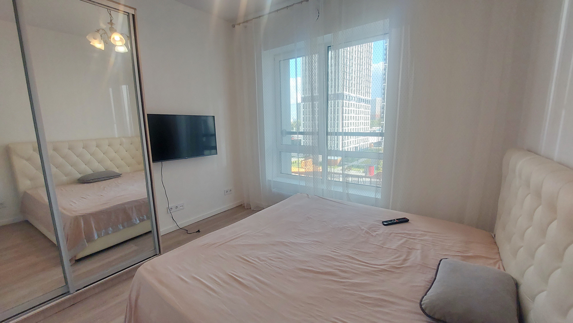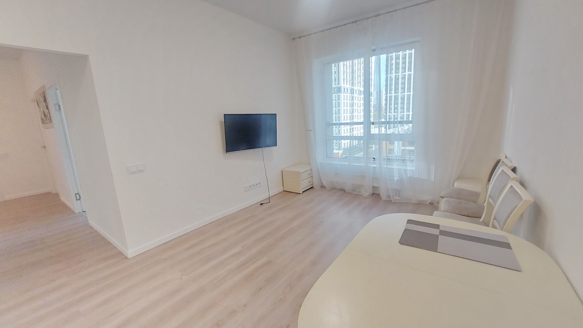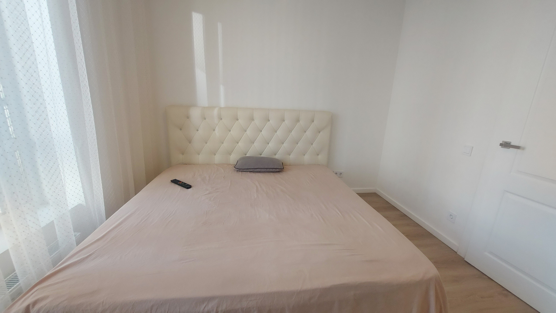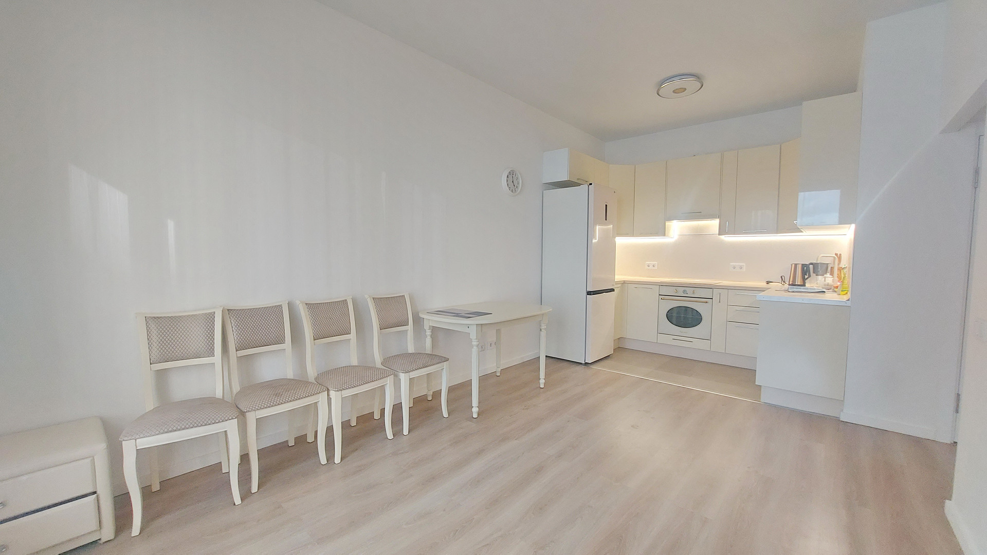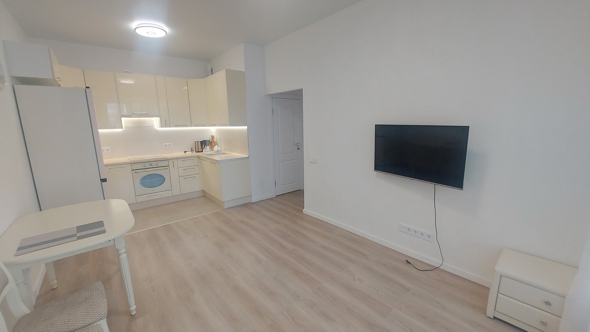 площадь 55 кв.м , две изолированные спальни и кухня-гостиная, 1,5 санузла.