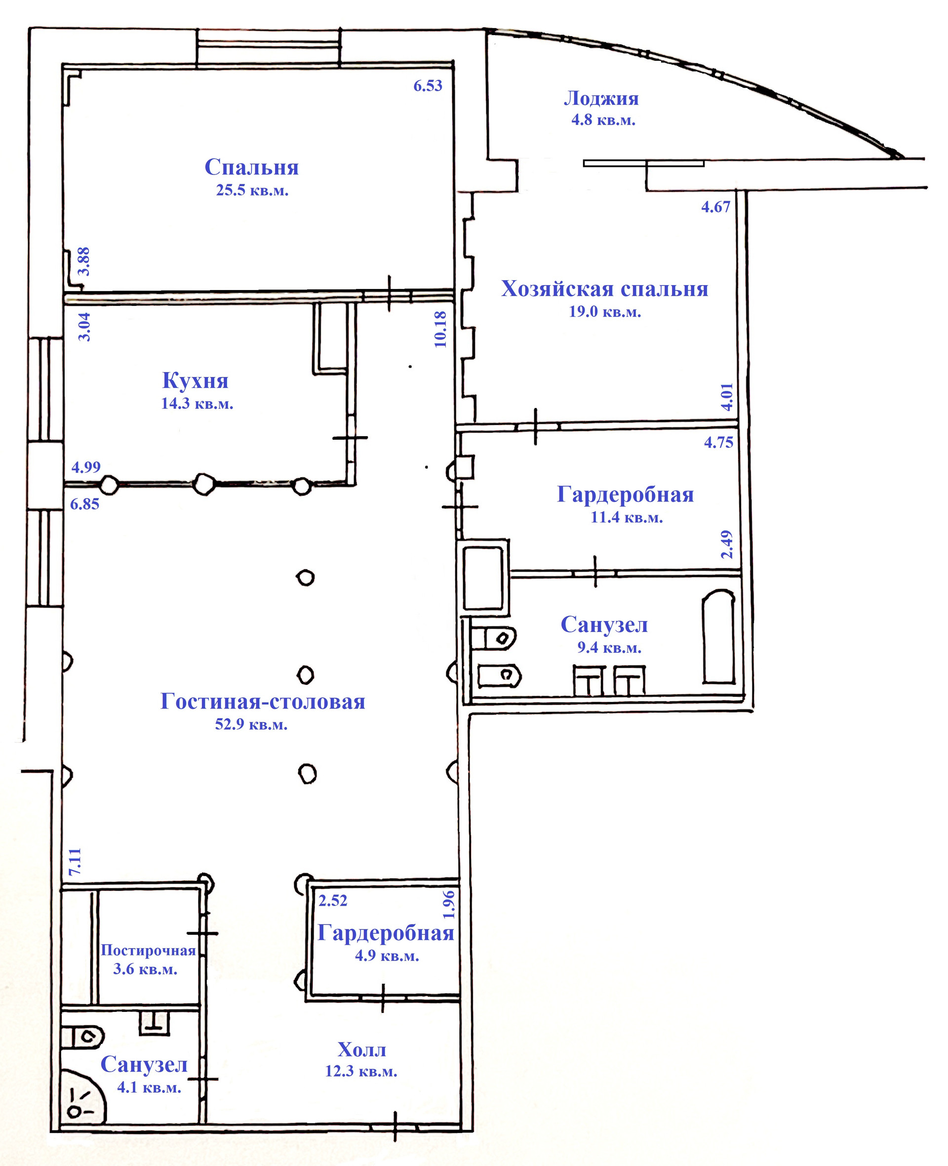 - Хозяйская спальня 19 кв.м., со своей гардеробной 11 кв.м., санузлом с ванной 9 кв.м., и кабинетом, размещенным на утепленной лоджии;