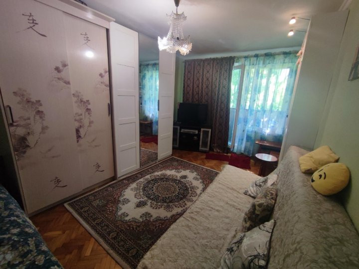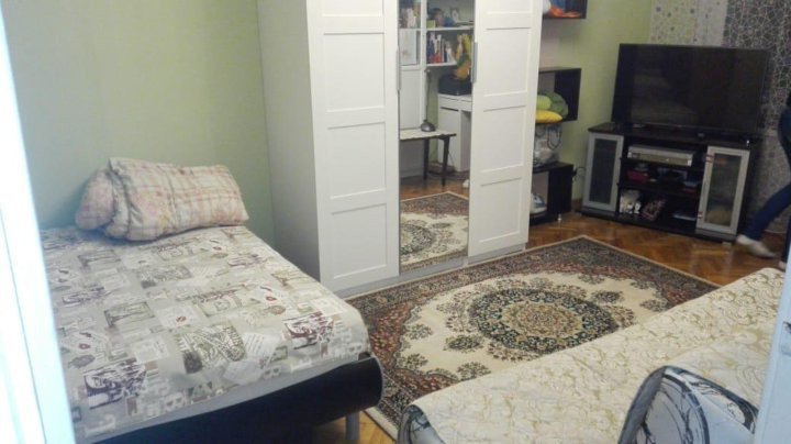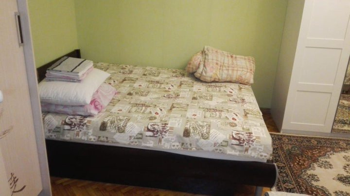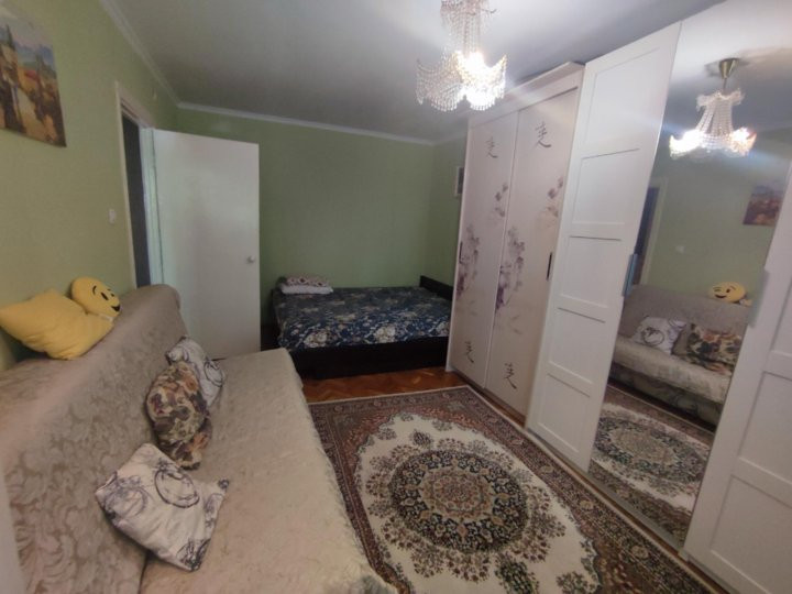 В просторной светлой комнате удобный новый диван и двуспальная кровать, два шкафа, полка, стол, телевизор, на полу мягкий ковёр, балкон, дом утопает в зелени. В доме недавно сделан ремонт, все чисто.