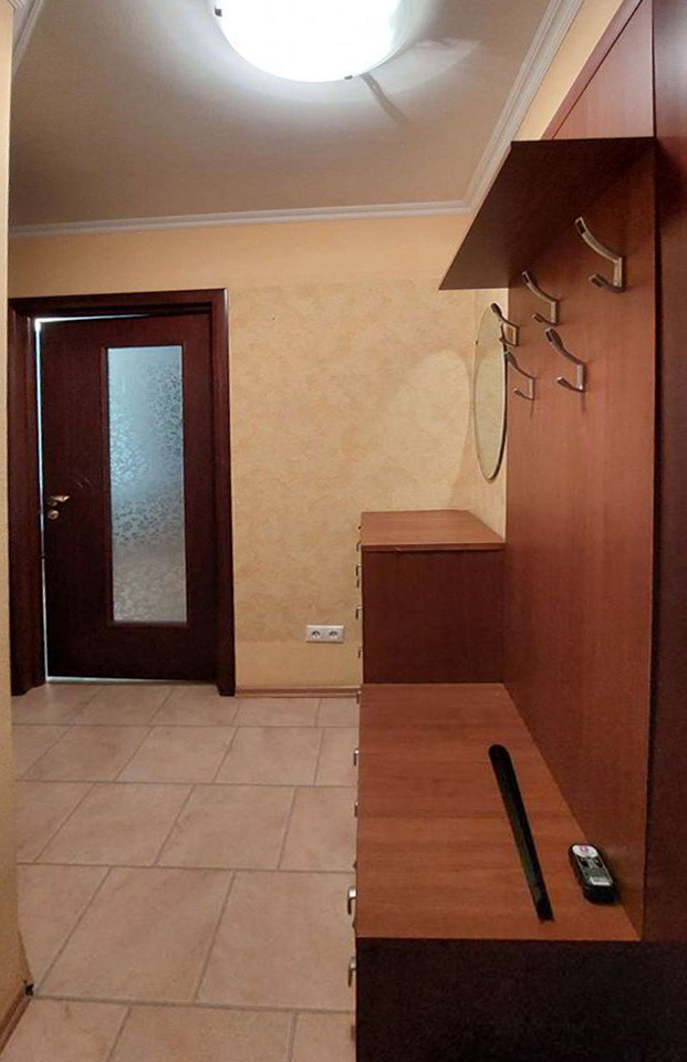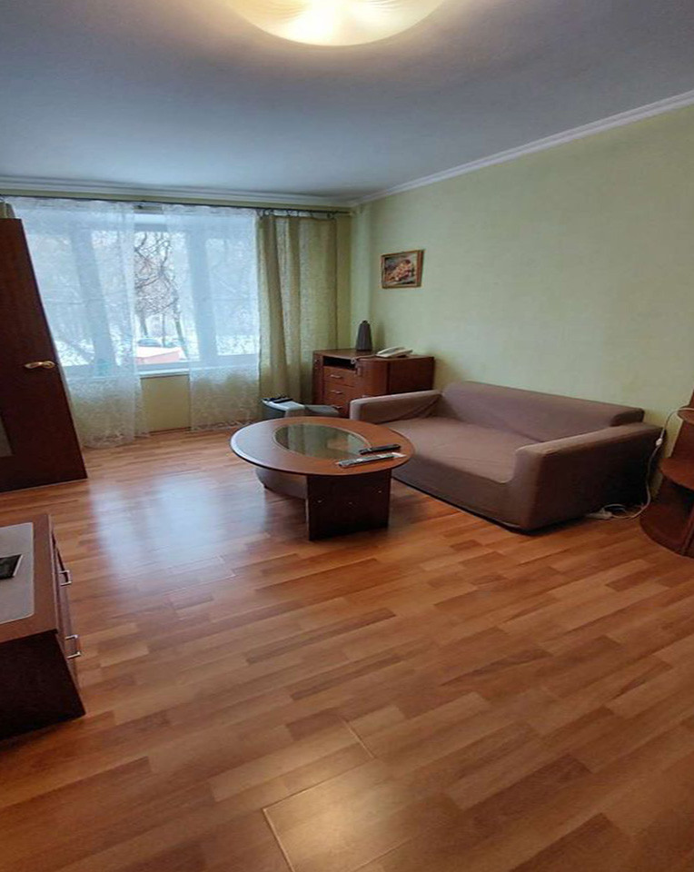 Просторная комната полностью меблирована: имеются два мягкий дивана, один раскладывается, практичные системы хранения, включая несколько шкафов, ЖК телевизор, кондиционер.  Стеклопакет, ламинат и светлые тона обоев.