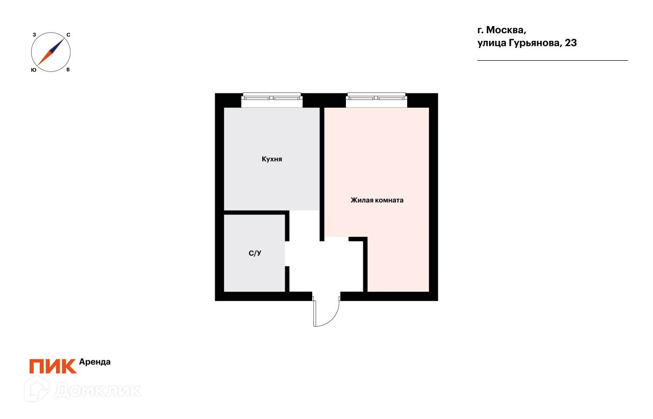 1-комнатная квартира, 25.7 м2, в аренду на длительный срок в Москве, улица Гурьянова, 23
