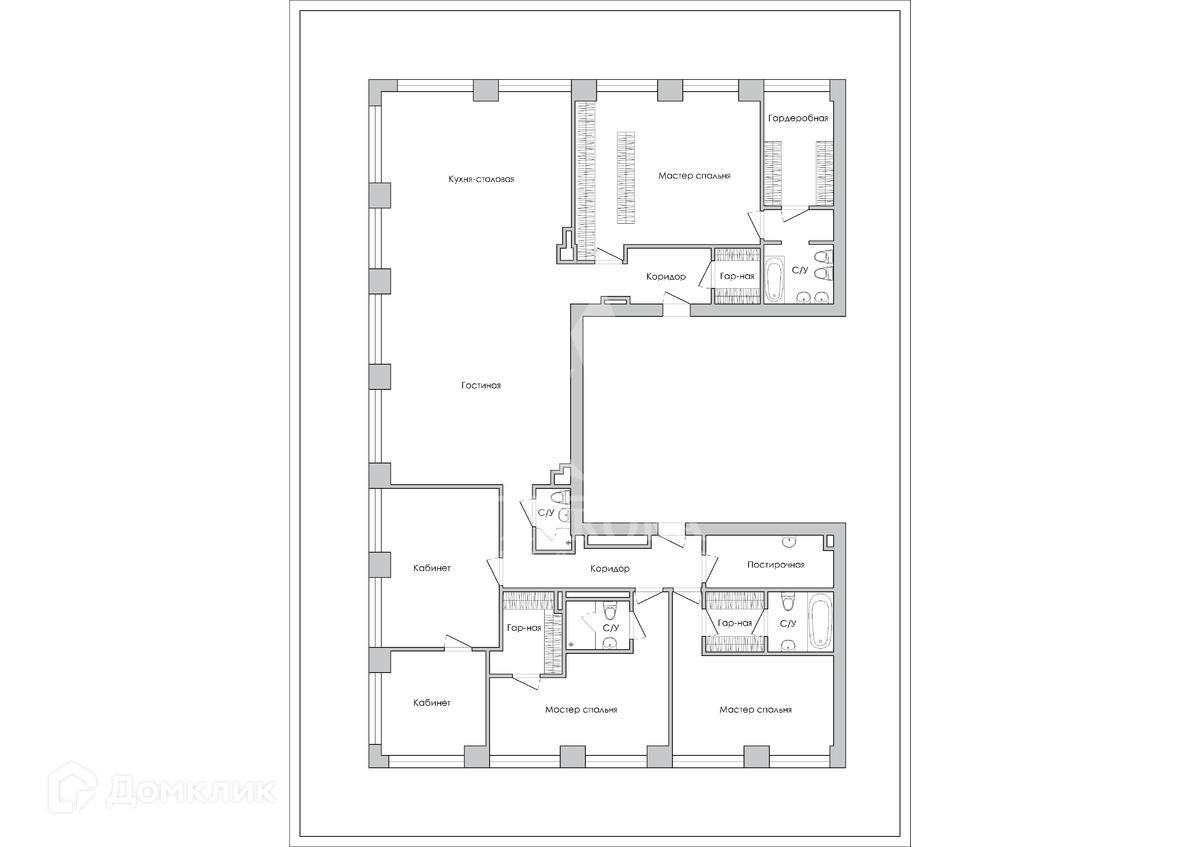Функциональная планировка квартиры включает в себя: просторную кухню-гостиную, оснащенную всей необходимой бытовой техникой и телевизором, мастер-спальню с гардеробной комнатой и санузлом, 2 спальни со своим гардеробными и санузлами, кабинет и зона отдыха (можно использовать как спальню), санузел, большую постирочную и роскошную прихожую.
