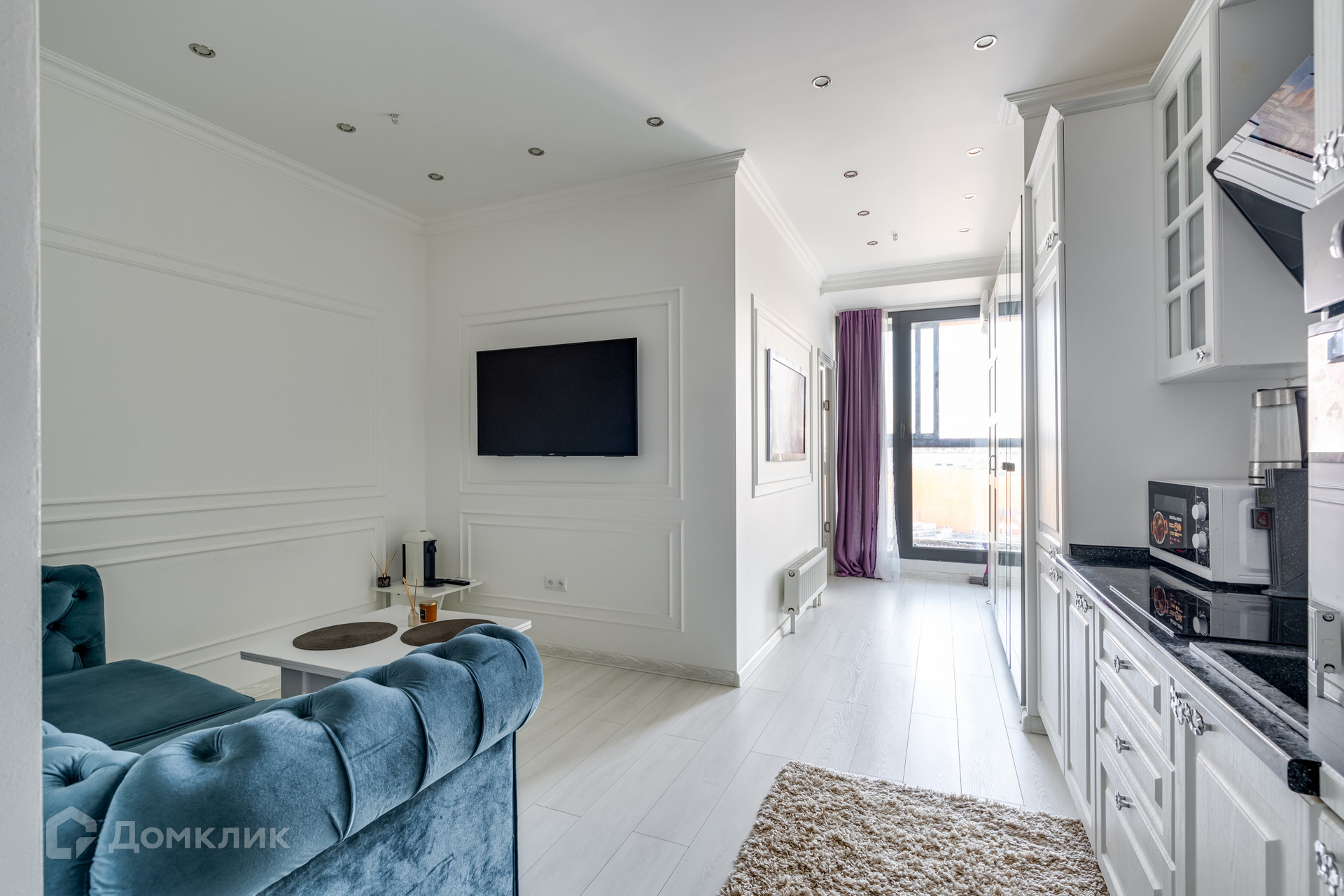 В студии реализован дизайн проект, выделена отдельная спальная комната, что удобно для проживания молодой пары. Квартира оборудована качественной мебелью и техникой от мировых производителей.