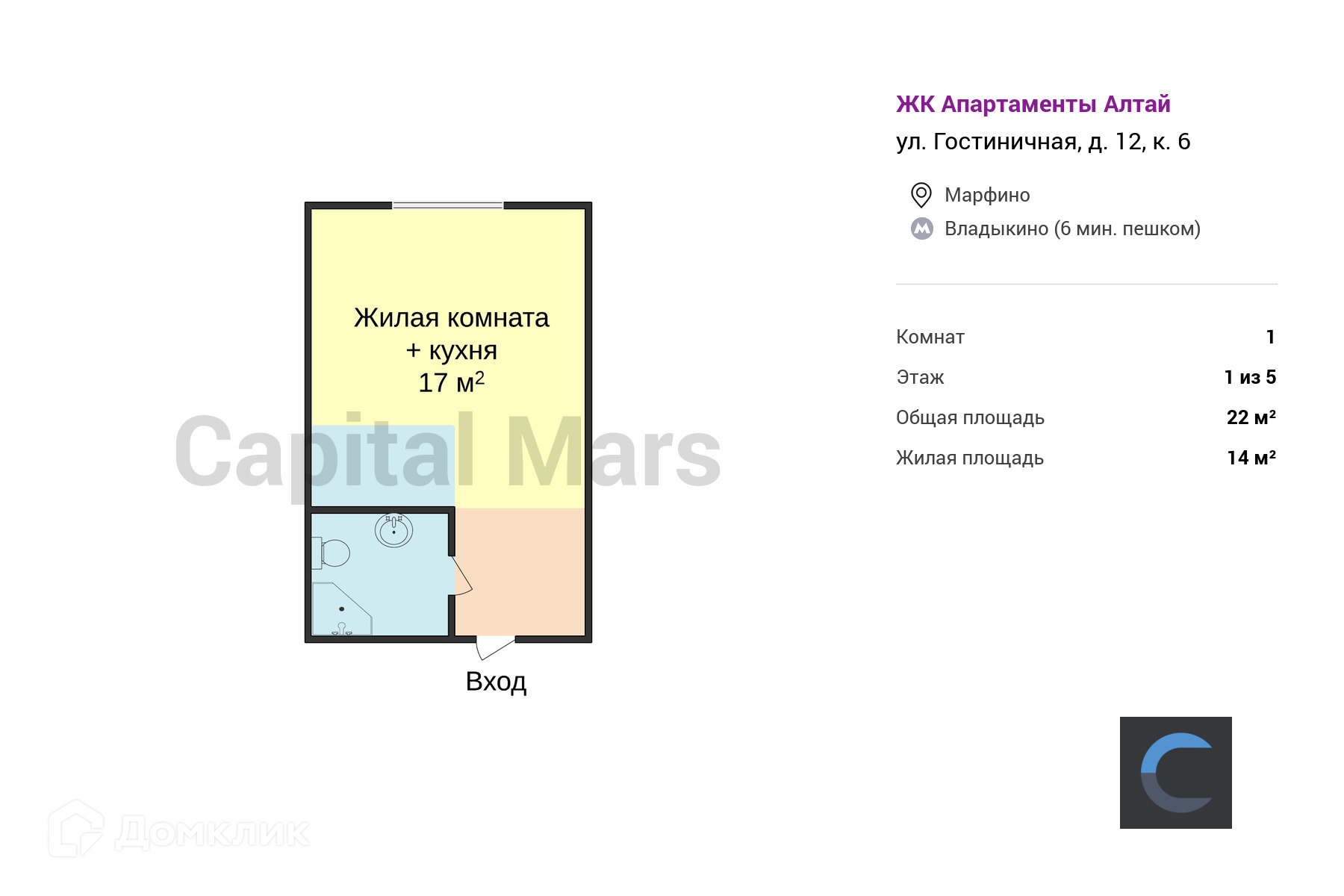 Общая площадь 22 м2