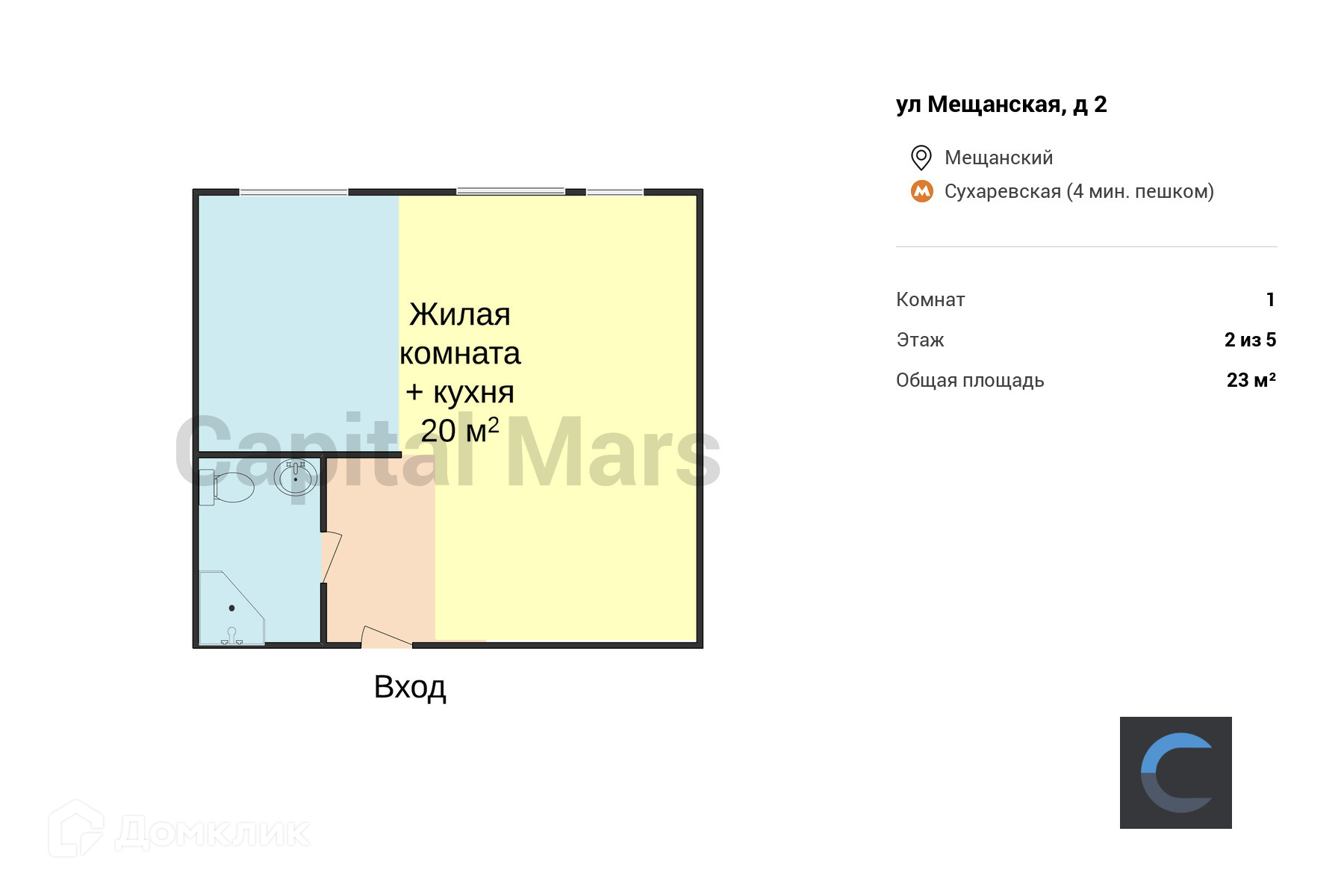 Общая площадь 23 м2