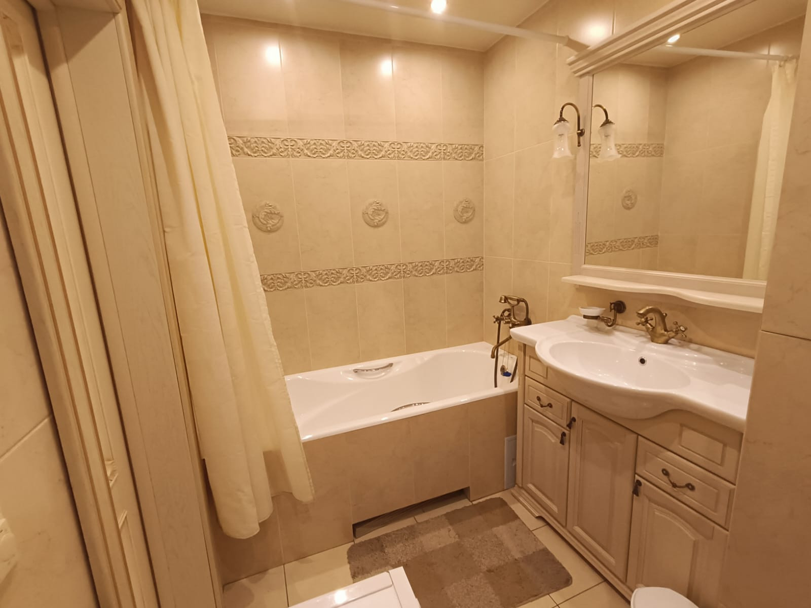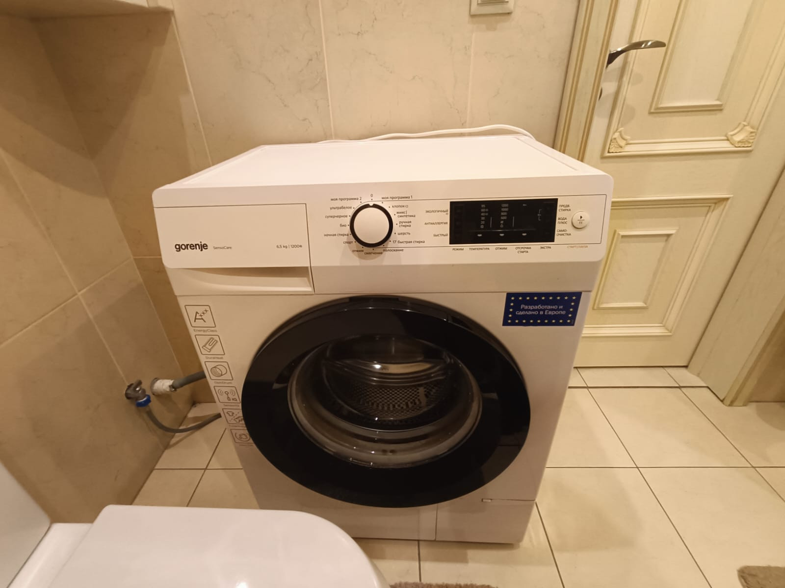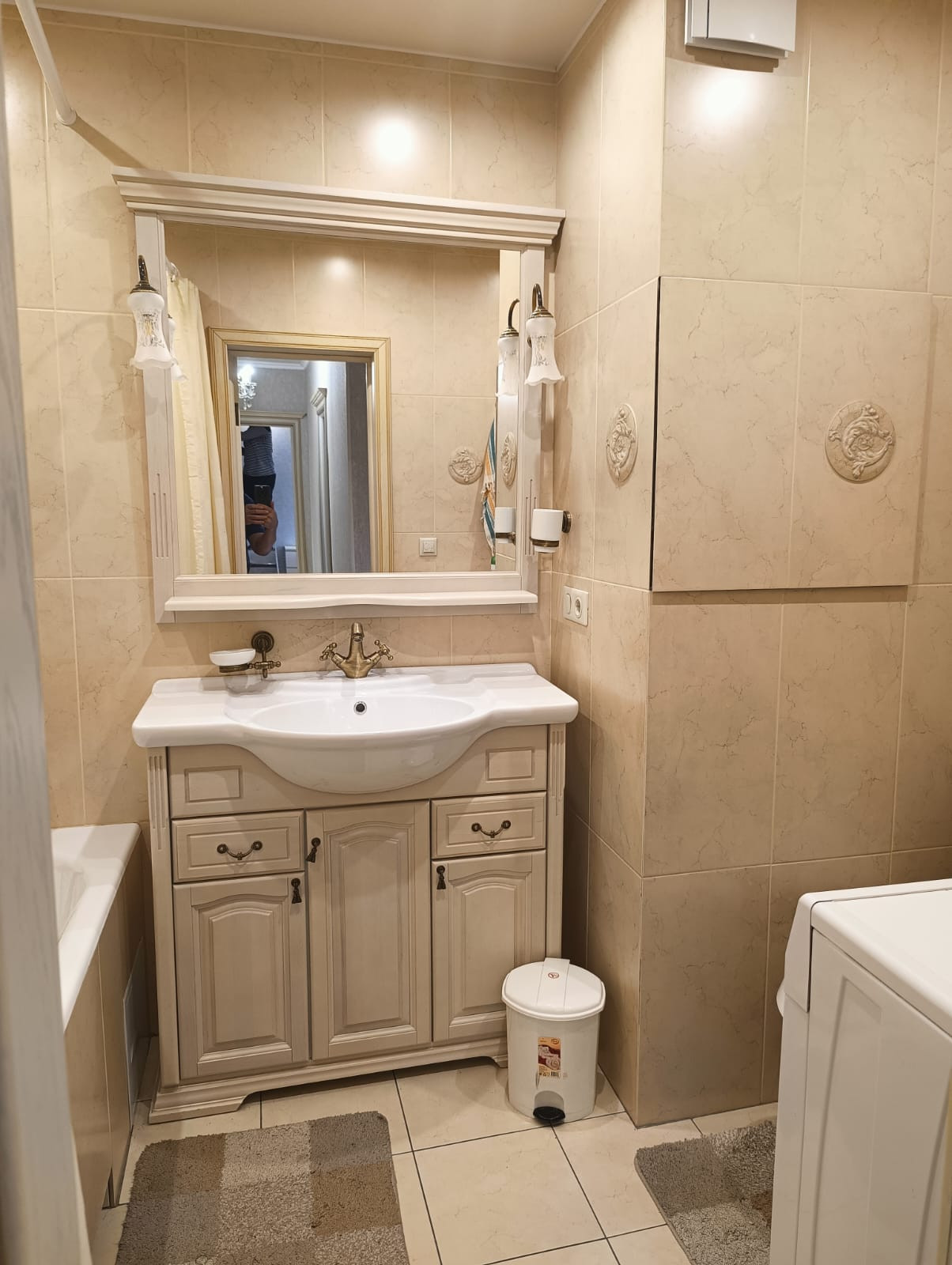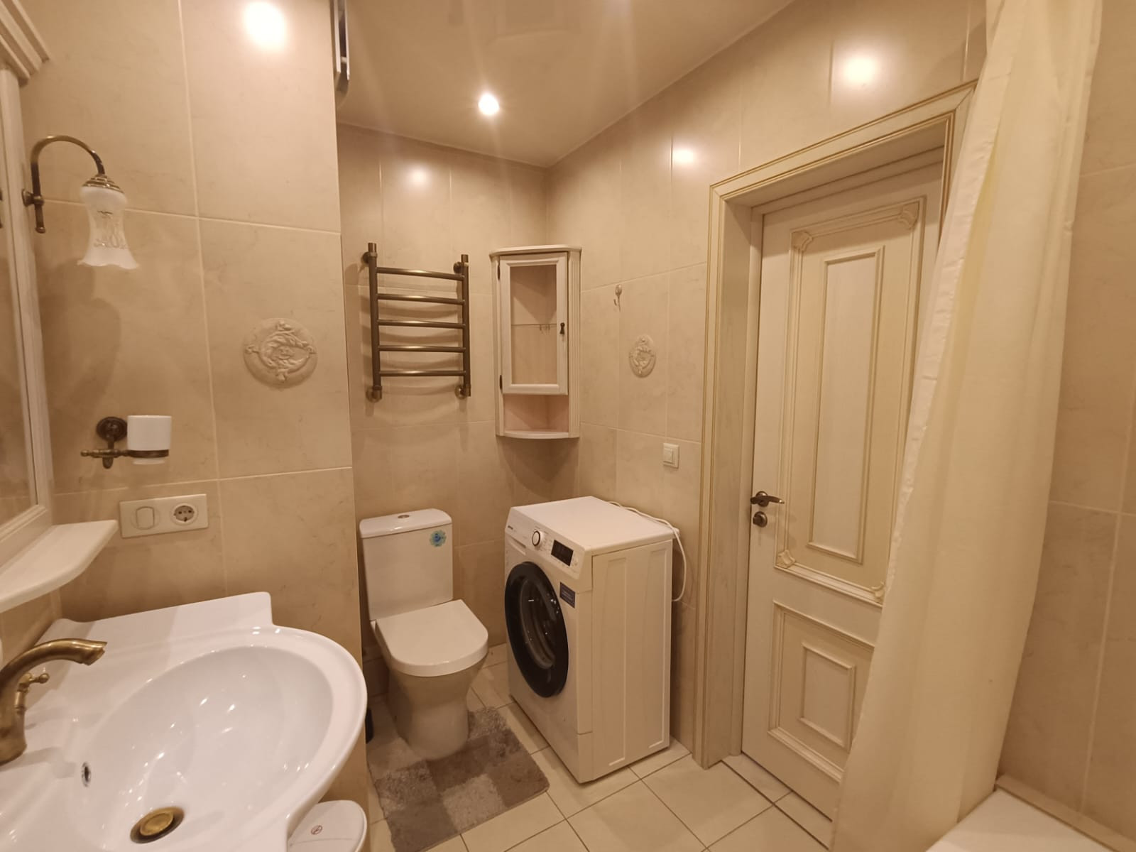 - просторная ванная комната с стиральной машиной Samsung;