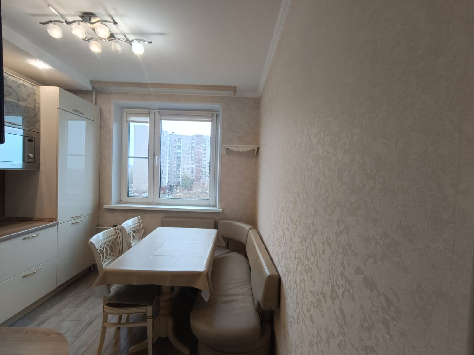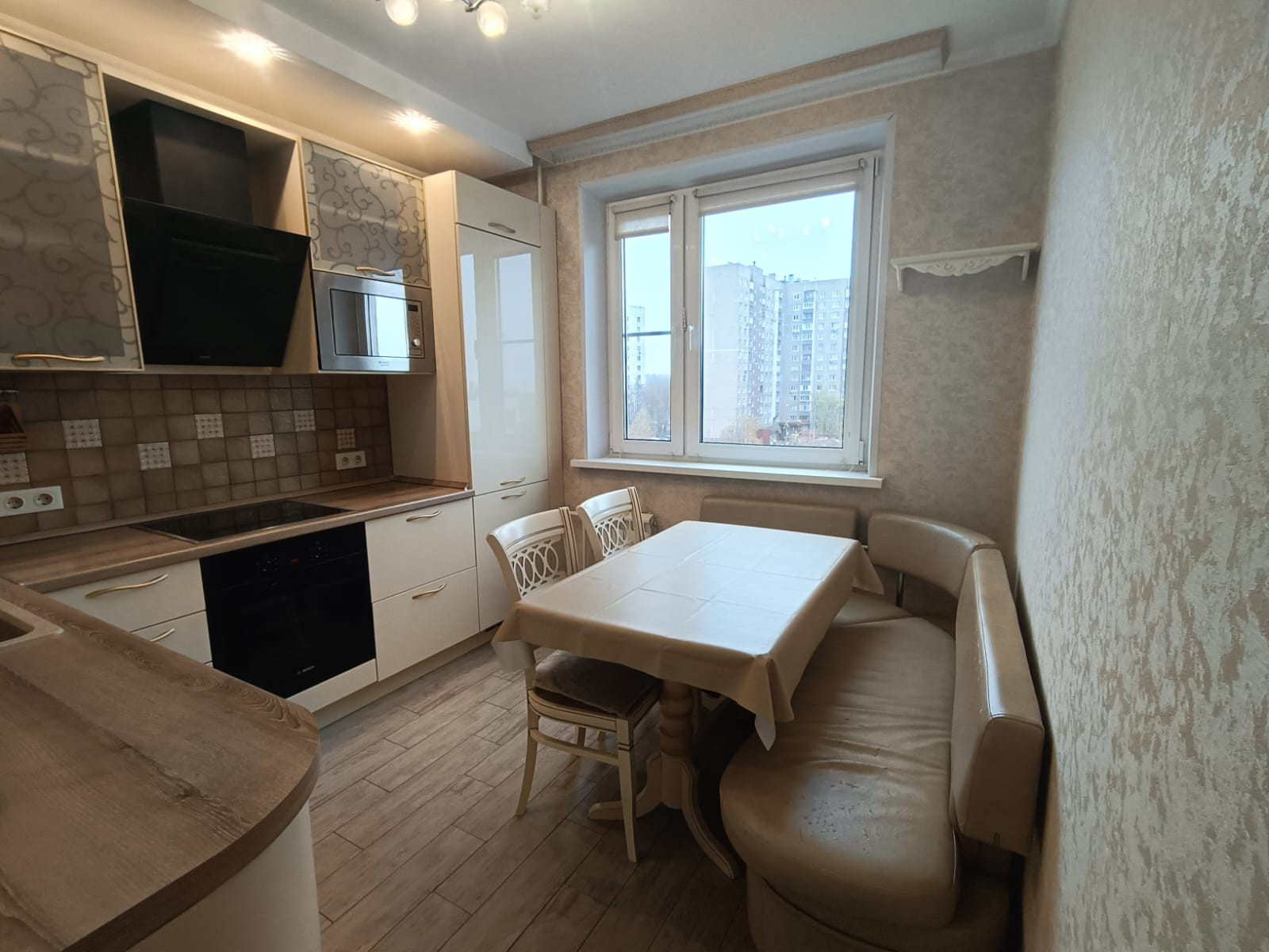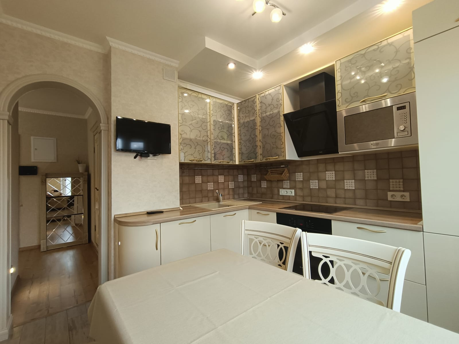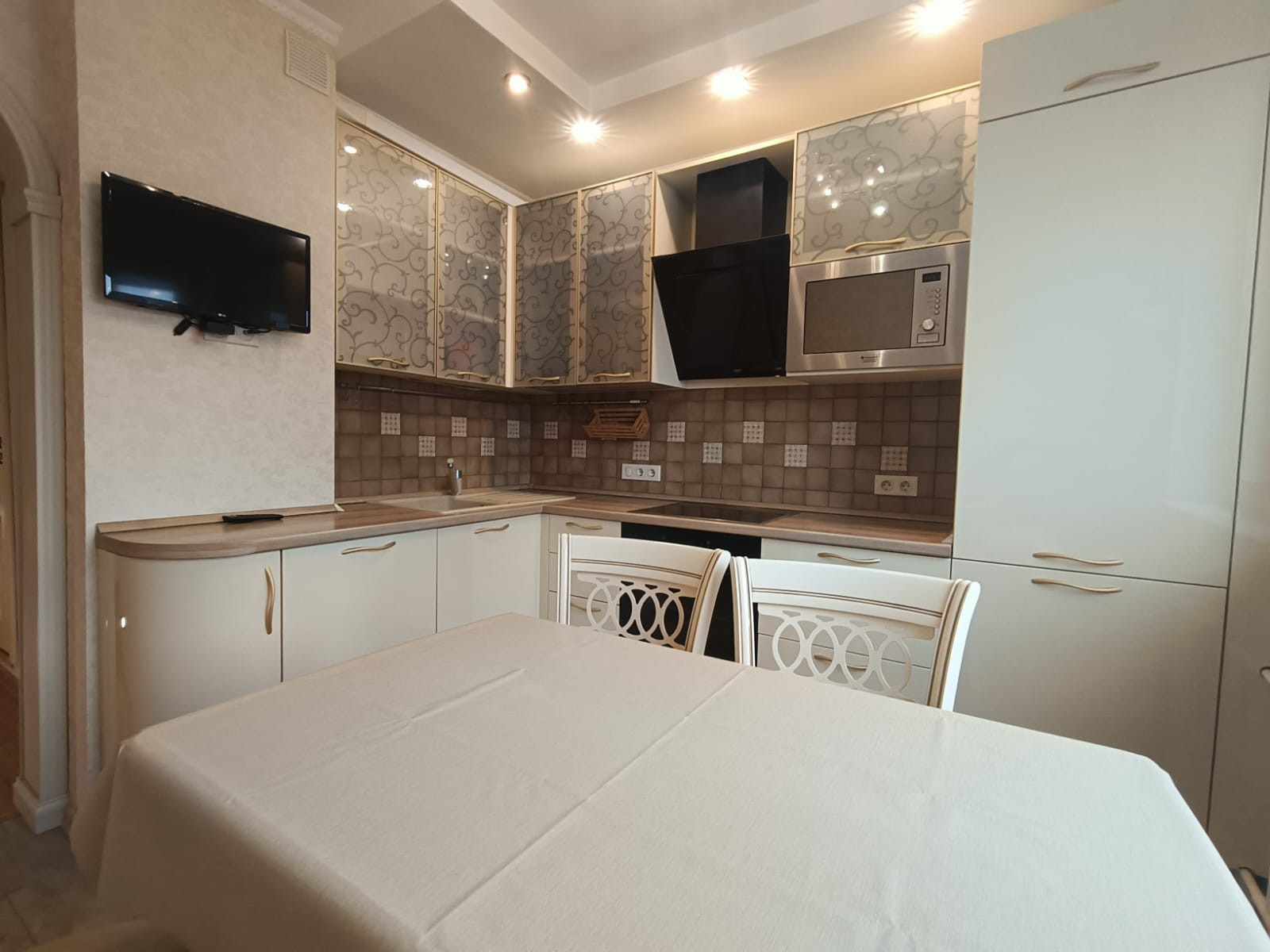 - функциональная кухня 9 кв.м., оборудованная встроенной бытовой техникой – холодильник, морозильная камера, варочная электрическая панель, духовой шкаф, вытяжка, микроволновая печь и телевизор;