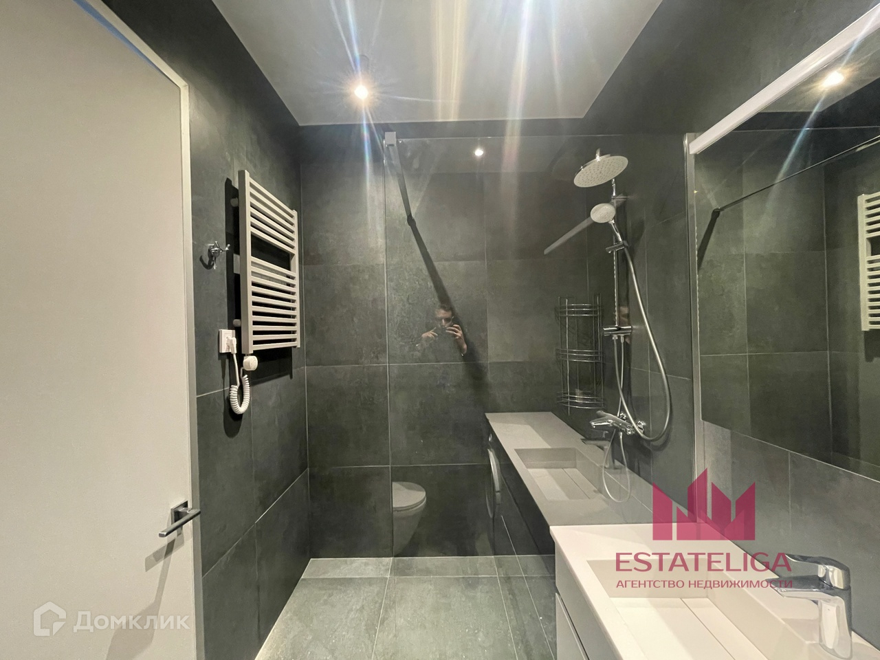 Обратите внимание на ванную комнату с просторной душевой, электрическим полотенцесушителем, большим зеркалом, стиральной машиной и шкафом, для хранения уходовых вещей и средств.