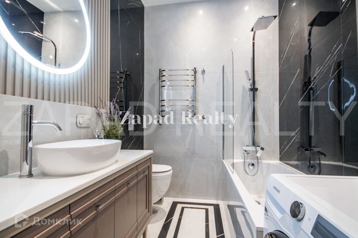 В зоне коридора и ванной -теплый пол. Ванная комната оснащена ванной, стиральной машиной, встроенными шкафами.
