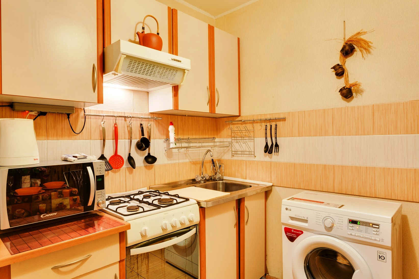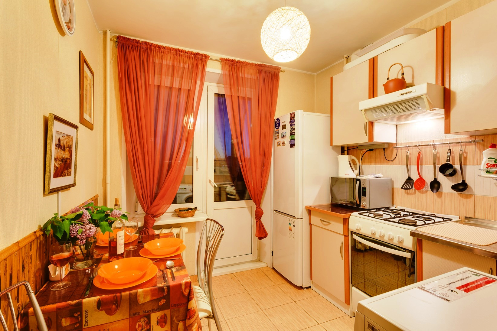 В кухне набор для кухни, стол, посуда, холодильник, печь СВЧ, кипятильник.