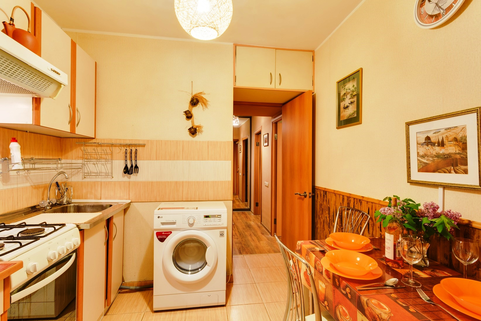 Стиральная машина, сушилка, гладильная доска, утюг.