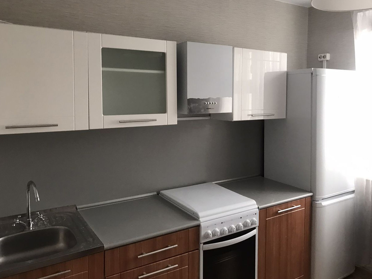 В просторной кухне - функциональное рабочее место, оснащенное современной бытовой техникой, включая духовую печь и варочную панель под единой столешницей, вытяжку, двухкамерный холодильник.