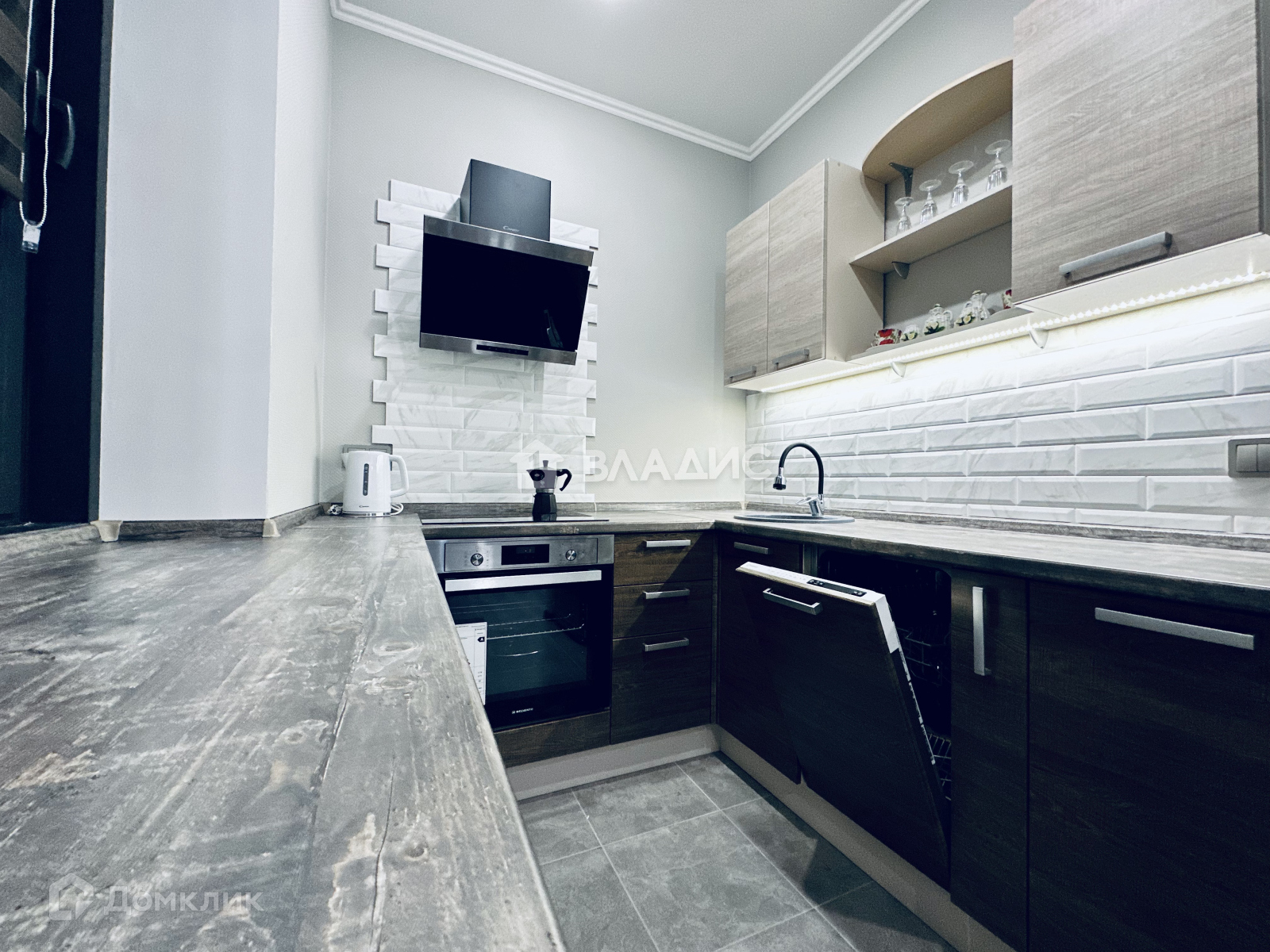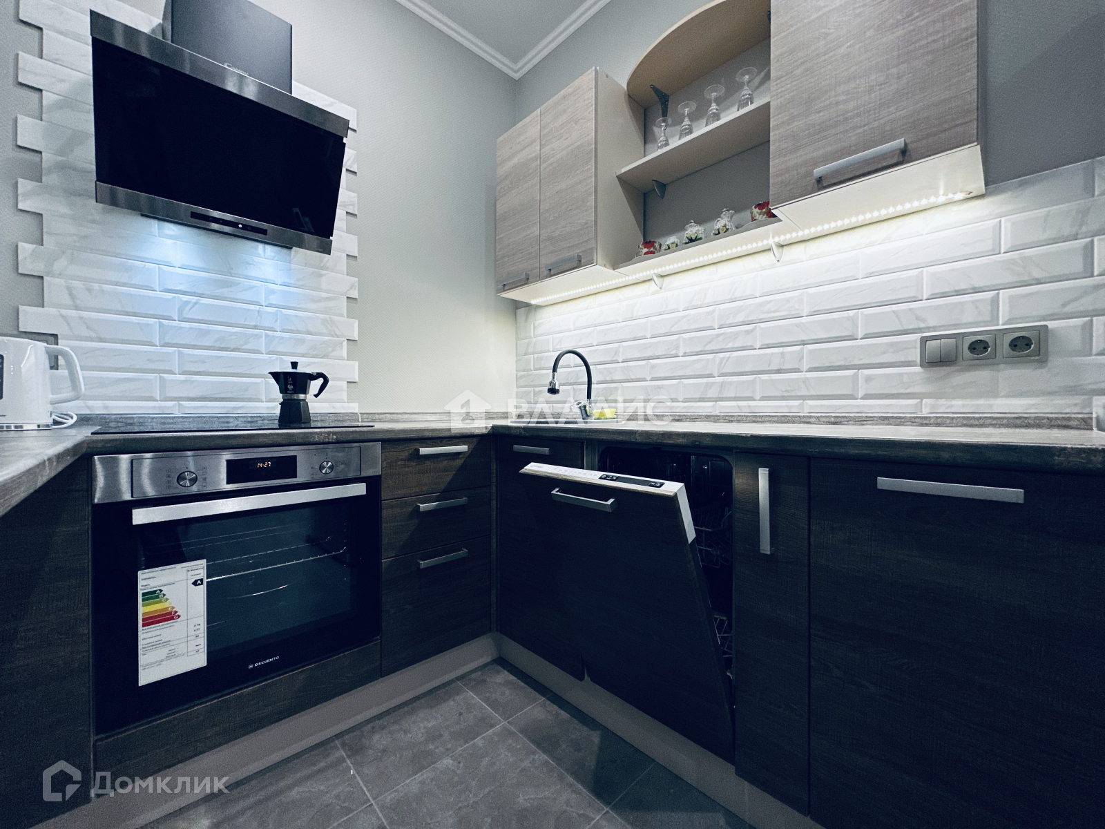 - вся необходимая техника: холодильник, встроенная плита с духовым шкафом, посудомоечная и стиральная машинки, наклонная вытяжка