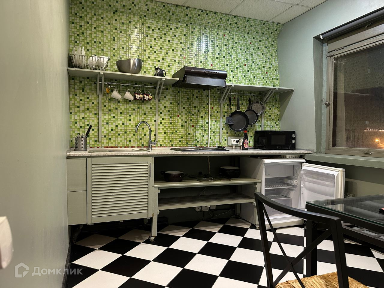 Из мебели - стеклянный стол с двумя стульями на кухне, маленький шкаф, вешалка, раскладной диван, двуспальное место - просто матрас.