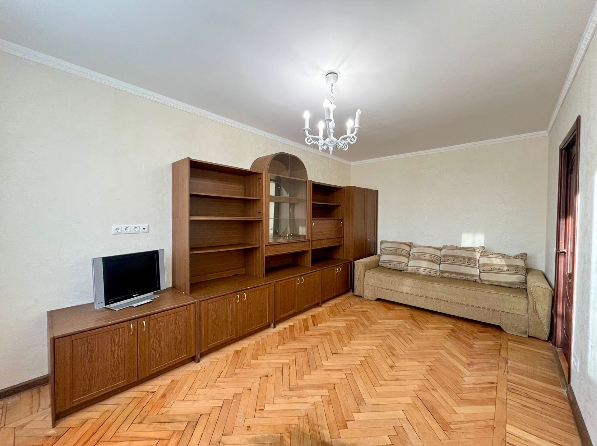 А именно: шкаф-стенка, кухонный гарнитур, большой и вместительный встроенный шкаф-купе, диван, кровать.