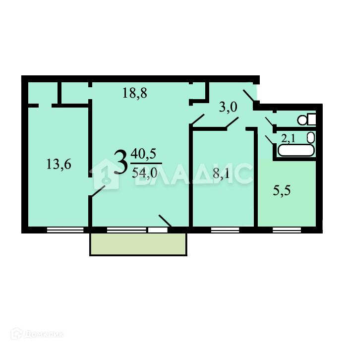 Общая площадь 55 м2